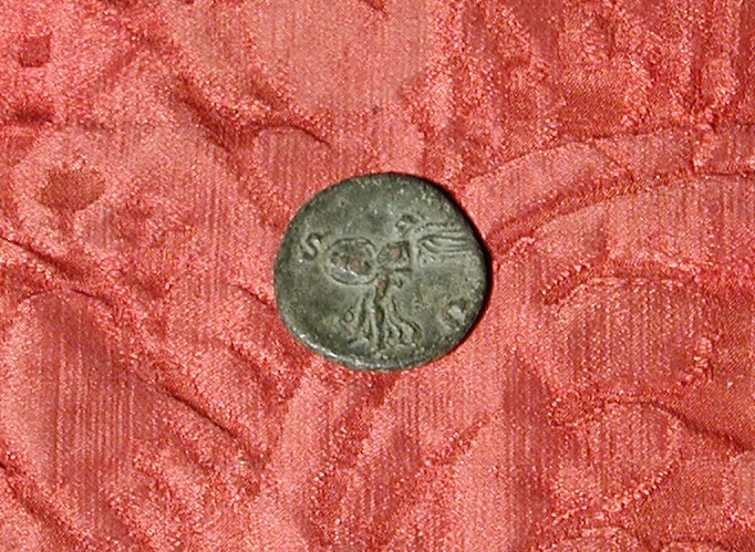 Dritto: testa laureata di Nerone, di profilo, a d.; c. non leggibile. Rovescio: Vittoria, drappeggiata, procedente verso s. con scudo rotondo; c. nonleggibile