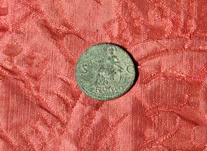 Dritto: testa di Nerone, con corona radiata, di profilo, a d.; c. non leggibile. Rovescio: Roma, elmata, in abiti militari, seduta verso s. sopra una corazza, con ilpiede d. appoggiato ad un elmo, porta una corona nella mano d. estesa etiene la mano s. sul fianco, sopra il parazonium; c. perlinato