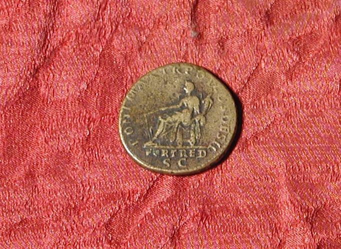 Dritto: testa radiato, di profilo, con drappo sulla spalla s., di Adriano a d.; c. perlinato consunto. Rovescio: Fortuna, seduta verso s., con cornucopia e timone; c. perlinato