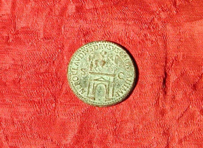 Dritto: testa laureata, di profilo, di Claudio a d.; c. perlinato. Rovescio: veduta di arco trionfale sormonatato da Druso a cavallo, rampante a d., in atto di trafiggere con lancia; ai lati due trofei; c. perlinato