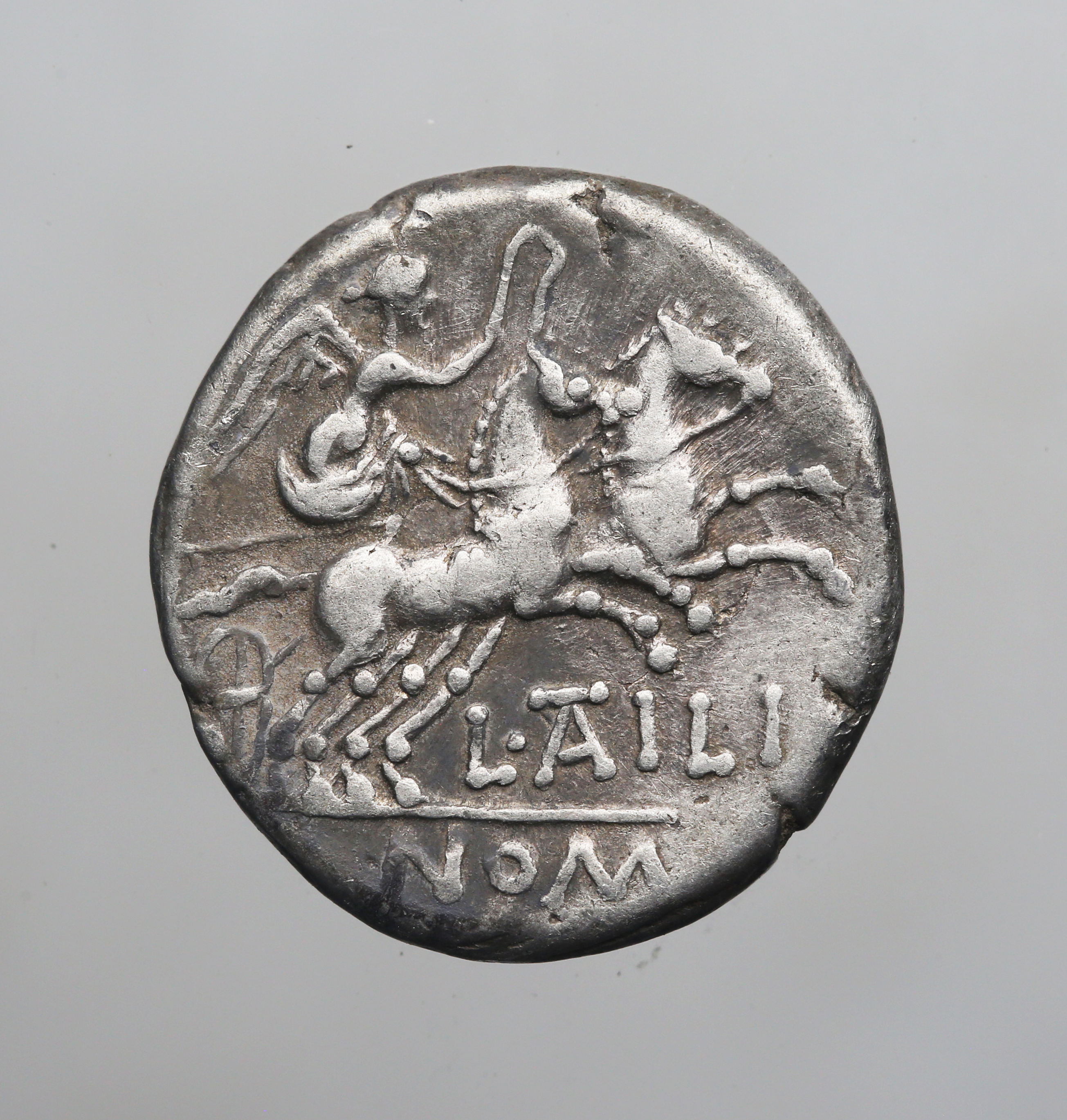 Dritto: Testa elmata di Roma a d.; dietro, numero di controllo XVI. Contorno perlinato. Rovescio: La Vittoria su biga verso d.; tiene le redini con la mano s., la frusta con la d.; sotto, L•AT ILI; in esergo, NOM. Contorno lineare