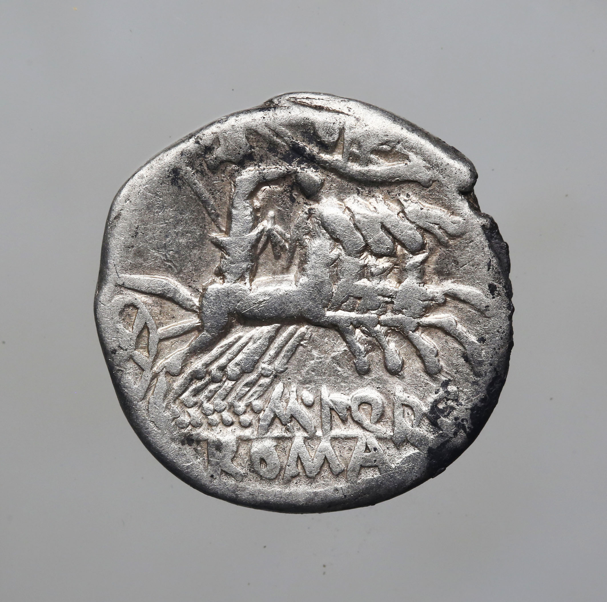 Dritto: Testa elmata di Roma a d.; davanti, segno di valore XVI; dietro, LAECA. Contorno perlinato. Rovescio: La Libertà (Libertas) in quadriga al galoppo a d.; tiene le redini e una verga (vindicta) con la mano s., un pileo con la d.; viene incoronata dalla Vittoria in volo; sotto, M•PORC; in esergo, ROMA. Contorno lineare