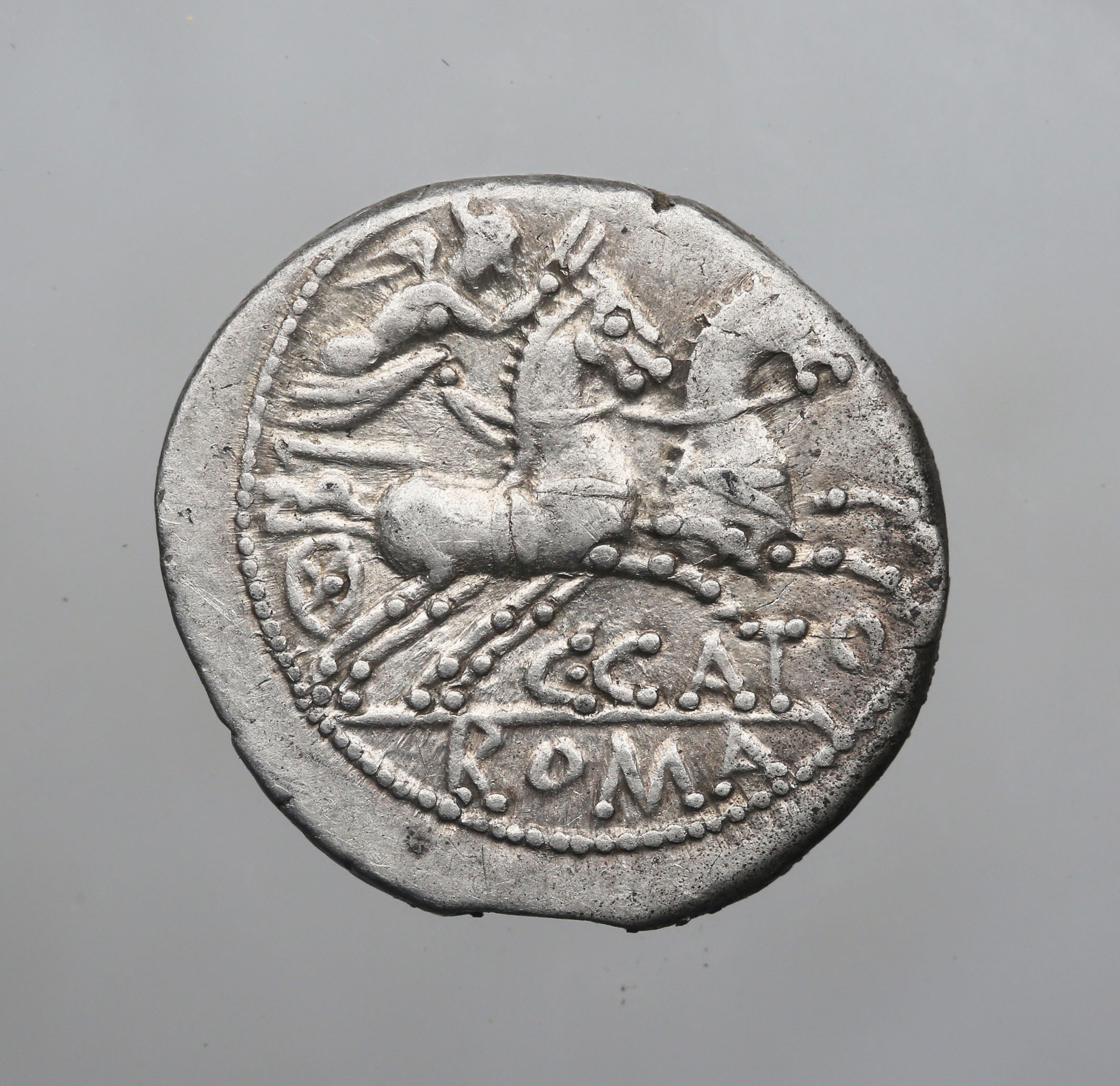 Dritto: Testa elmata di Roma a d.; dietro, segno di valore X. Contorno perlinato. Rovescio: La Vittoria su biga verso d.; tiene le redini con la mano s., la frusta con la d.; Sotto, C•CATO; in esergo, ROMA. Contorno perlinato