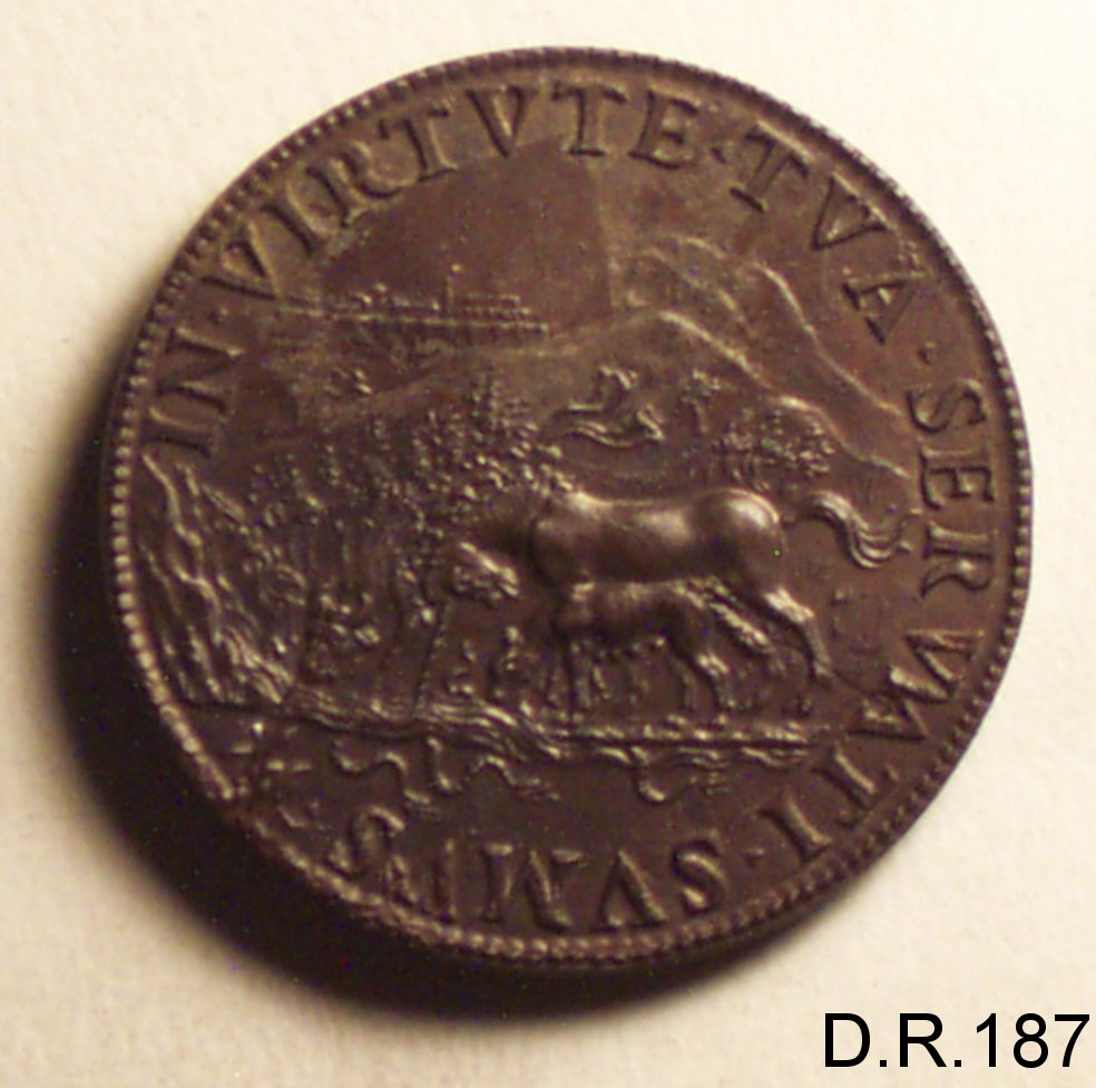 Dritto: busto di papa Paolo III volto a s.; con piviale, capo nudo, barba. Rovescio: un unicorno imm.rge il suo corno in un ruscello, dove si abbeverano untoroe una lupa. dal ruscello fuggono due serpenti