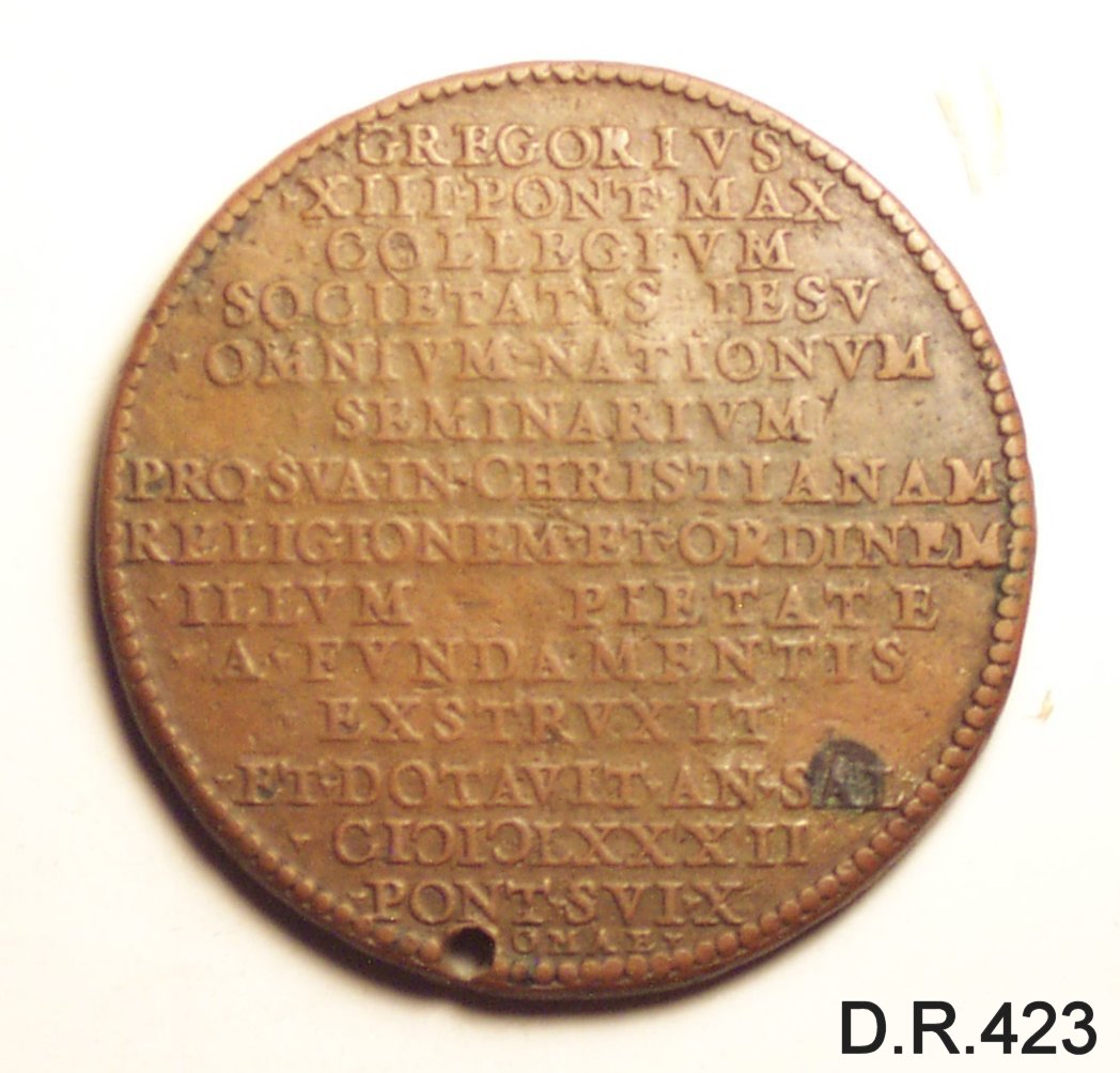Dritto: papa gregorio XIII, in trono a sinistra, benedice i gesuiti; su unalapidea destra l'iscrizione: ite/ operamini./ in. vinea./ do[..]ni. Rovescio: legenda