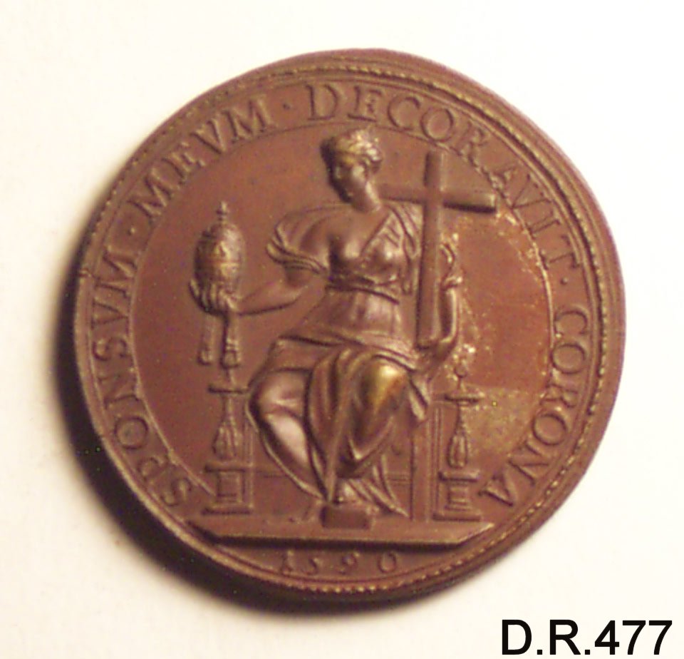 Dritto: busto di Urbano VII volto a sinistra con piviale, capo nudo e barba. Rovescio: donna seduta che regge nella mano sinistra una croce e in quella destrail triregno