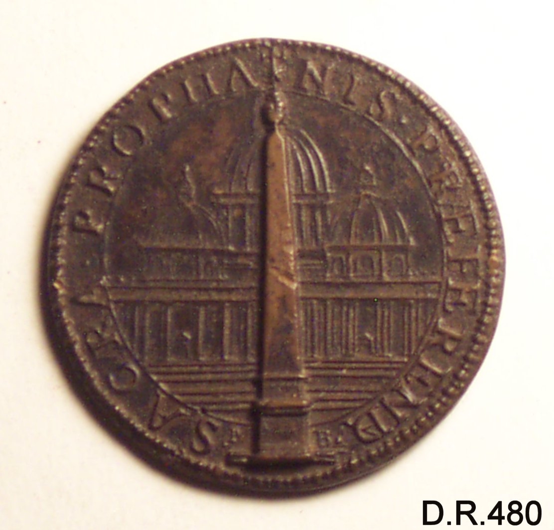 Dritto: busto di Sisto V volto a destra con piviale, capo nudo e barba. Rovescio: la facciata di san pietro in roma e l'obelisco della piazza