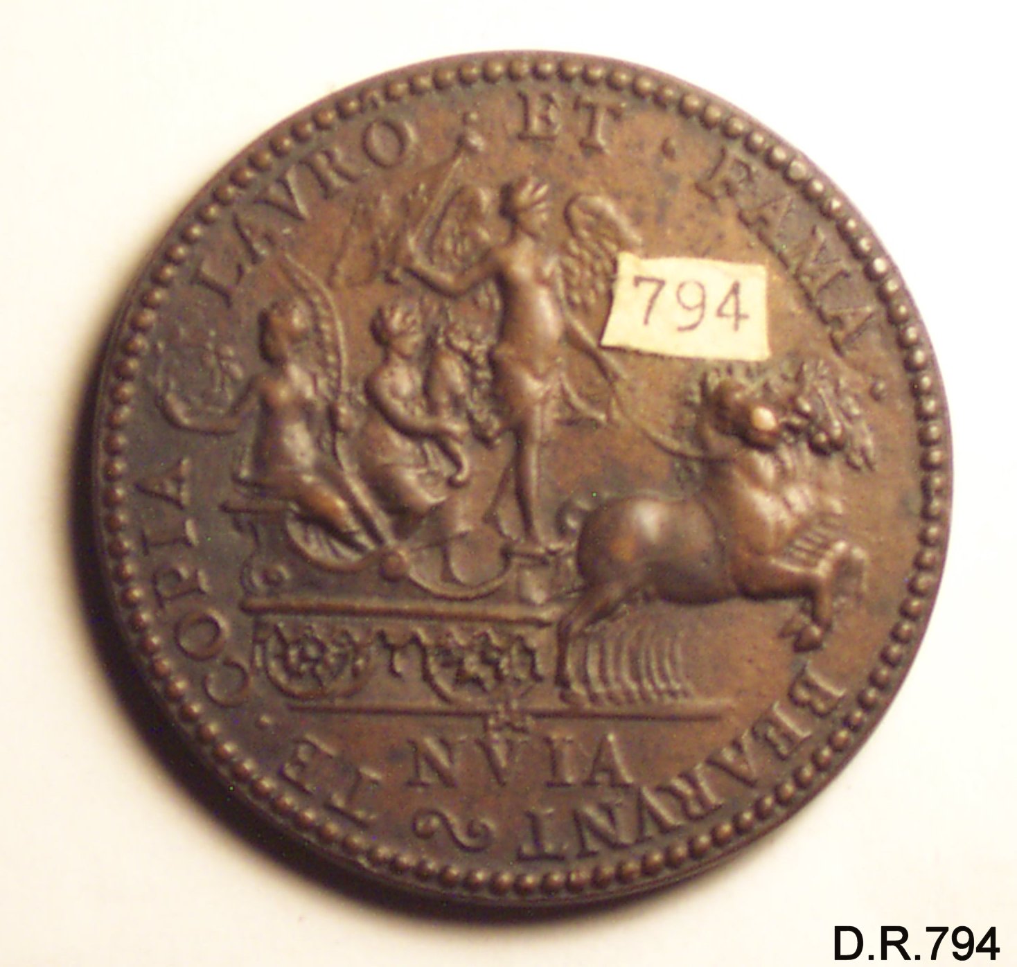 Dritto: Busto di Enrico II di Francia volto a destra con corazza, capo concoronad'alloro e barba. Rovescio: La Pace e l'Abbondanza sedute in quadriga guidata dalla Fama