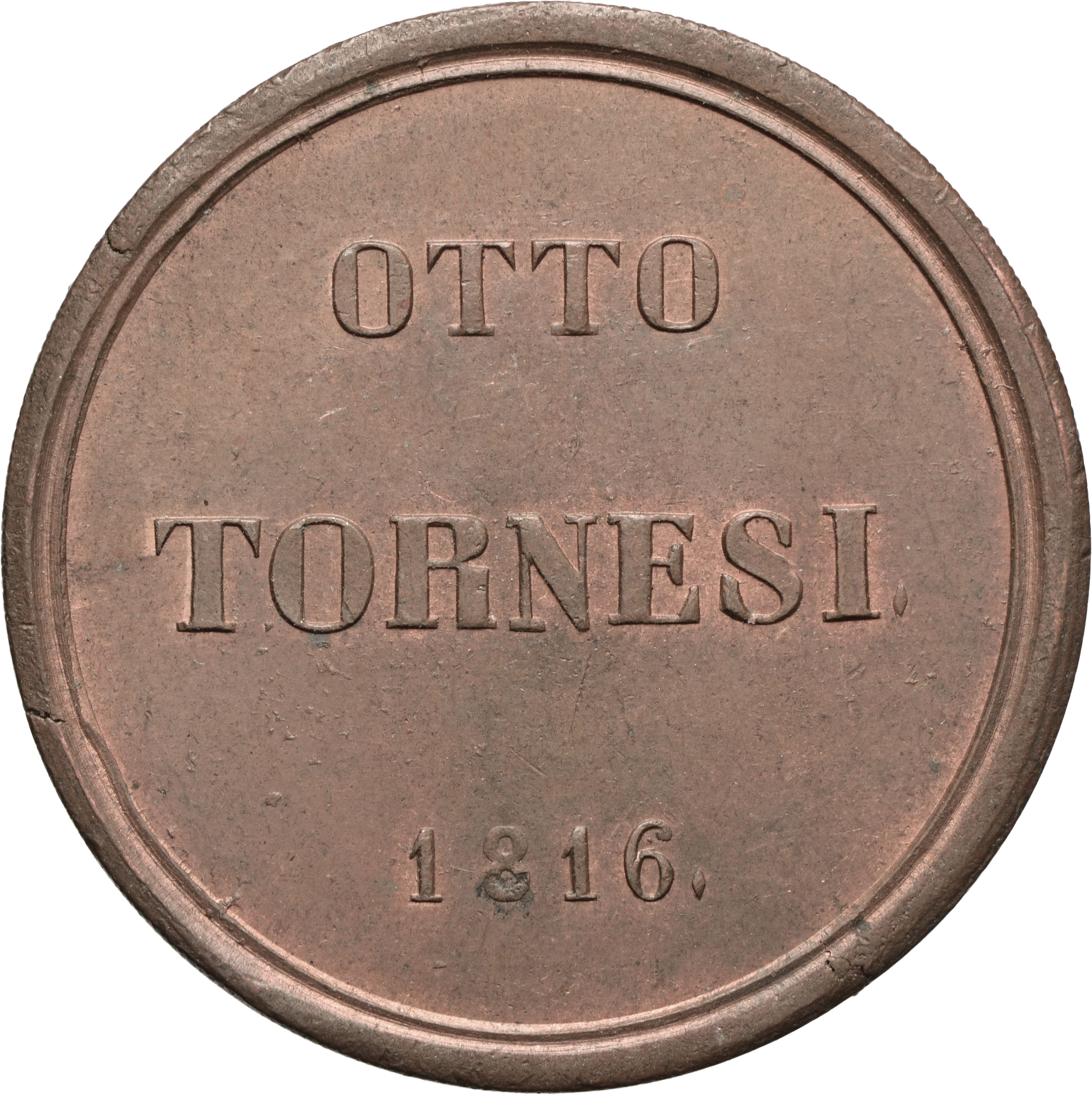 Dritto: Testa coronata del re volta a s. Campo monetale delimitato da cornice liscia e filetto lineare. Rovescio: Nel campo, OTTO | TORNESI | 1816♦. Campo monetale delimitato da cornice liscia e filetto lineare