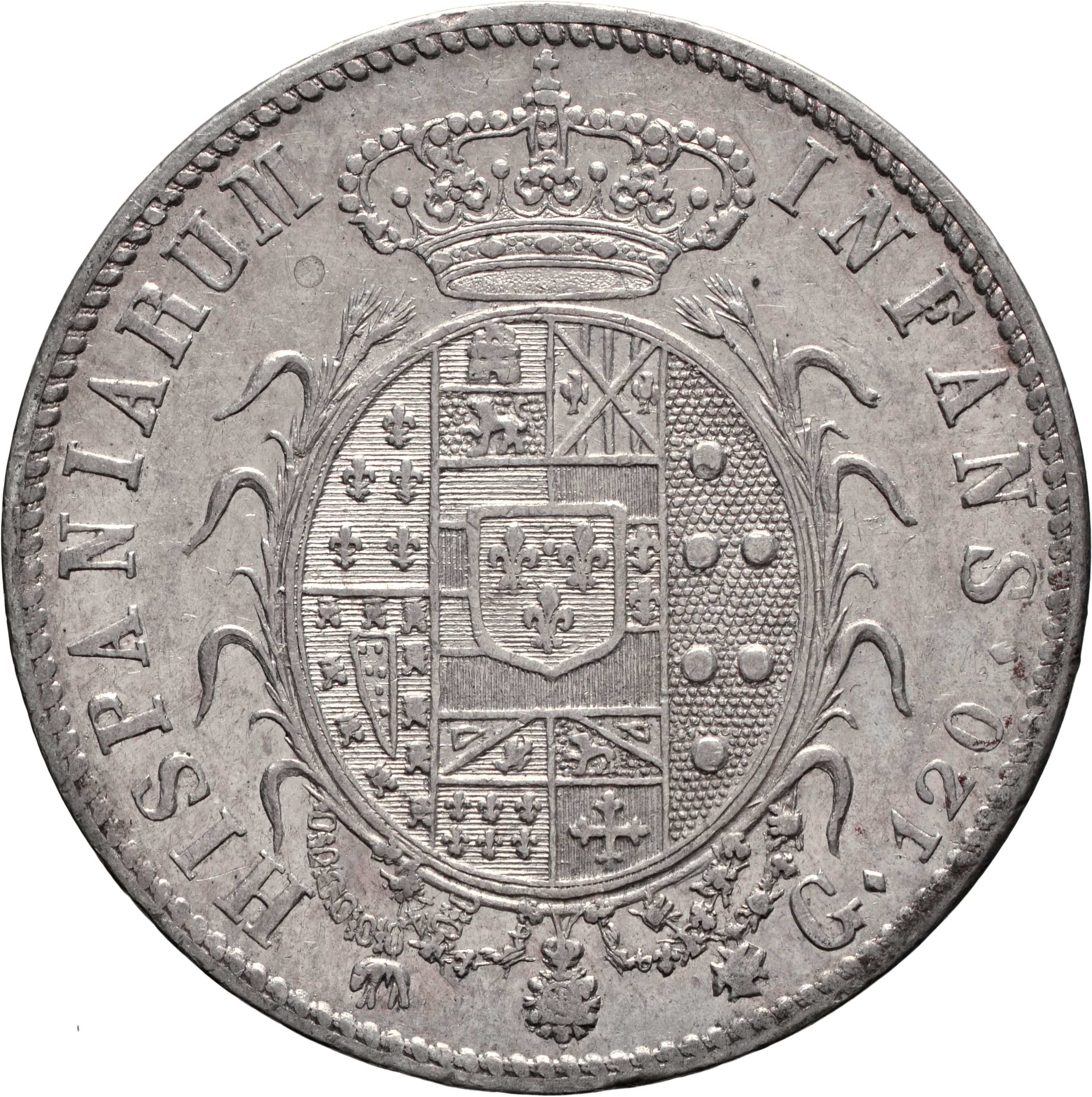 Dritto: Busto maturo del re volto a d., con fluenti capelli ricci e coperto da clamide; sotto, 1816♦. Campo monetale delimitato da cornice con filetto dentellato. Rovescio: Scudo ovale in cartella semplice, cinto da spighe dalle quali pendono i collari di Ordine del Toson d’oro, Ordine di san Ferdinando e del Merito, Ordine di Carlo III, interzato in palo: nel 1°, troncato di Farnese e Portogallo; nel 2°, interzato in fascia: in a), partito, in 1), di Castiglia e León, in 2), di Sicilia, in b), partito di Austria e Borgogna Moderna, in c), inquartato 1) tagliato di Borgogna Antica e Fiandre, 2) trinciato di Tirolo e Brabante, 3) di Angiò, 4) di Gerusalemme; nel 3°, di Medici; nel centro, scudetto di Borbone. Nel campo a destra, contro l’orlo, G♦ 120♦. Campo monetale delimitato da cornice con filetto dentellato