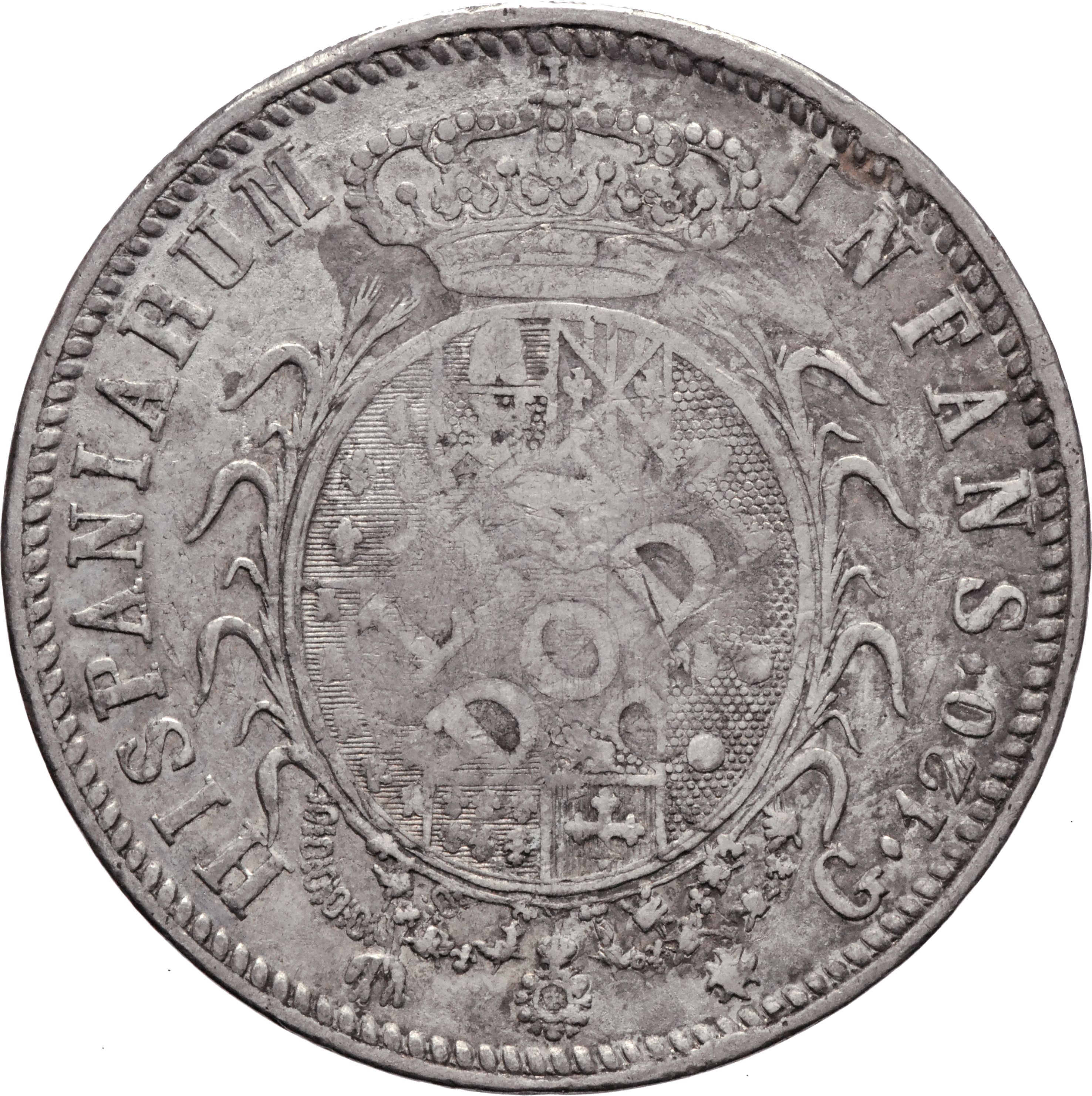 Dritto: Busto maturo del re volto a d., con fluenti capelli ricci e coperto da clamide; sotto, R♦ 1816♦. Campo monetale delimitato da cornice con filetto dentellato. Rovescio: Scudo ovale in cartella semplice, cinto da spighe dalle quali pendono i collari di Ordine del Toson d’oro, Ordine di san Ferdinando e del Merito, Ordine di Carlo III, interzato in palo: nel 1°, troncato di Farnese e Portogallo; nel 2°, interzato in fascia: in a), partito, in 1), di Castiglia e León, in 2), di Sicilia, in b), partito di Austria e Borgogna Moderna, in c), inquartato 1) tagliato di Borgogna Antica e Fiandre, 2) trinciato di Tirolo e Brabante, 3) di Angiò, 4) di Gerusalemme; nel 3°, di Medici; nel centro, scudetto di Borbone. Nel campo a destra, contro l’orlo, G♦ 120. Campo monetale delimitato da cornice con filetto dentellato