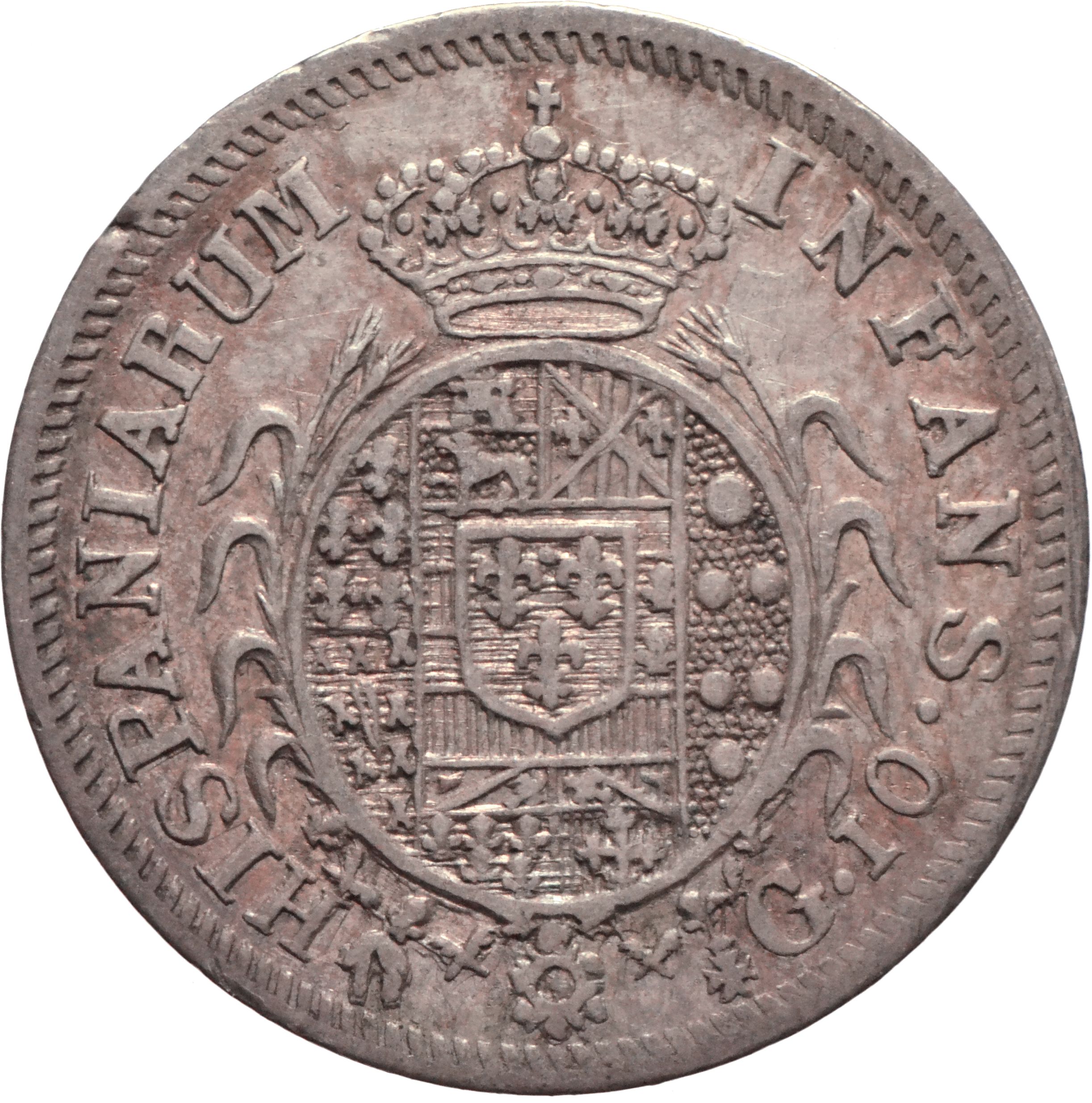 Dritto: Testa matura del re volta a d., con capelli ricci e collo coperto da clamide; sotto, 1816. Campo monetale delimitato da cornice con filetto dentellato. Rovescio: Scudo ovale in cartella semplice, cinto da spighe dalle quali pendono i collari di Ordine del Toson d’oro, Ordine di san Ferdinando e del Merito, Ordine di Carlo III, interzato in palo: nel 1°, troncato di Farnese e Portogallo; nel 2°, interzato in fascia: in a), partito, in 1), di Castiglia e León, in 2), di Sicilia, in b), partito di Austria e Borgogna Moderna, in c), inquartato 1) tagliato di Borgogna Antica e Fiandre, 2) trinciato di Tirolo e Brabante, 3) di Angiò, 4) di Gerusalemme; nel 3°, di Medici; nel centro, scudetto di Borbone. Nel campo, a destra, contro l’orlo, G. / 10. Campo monetale delimitato da cornice con filetto dentellato