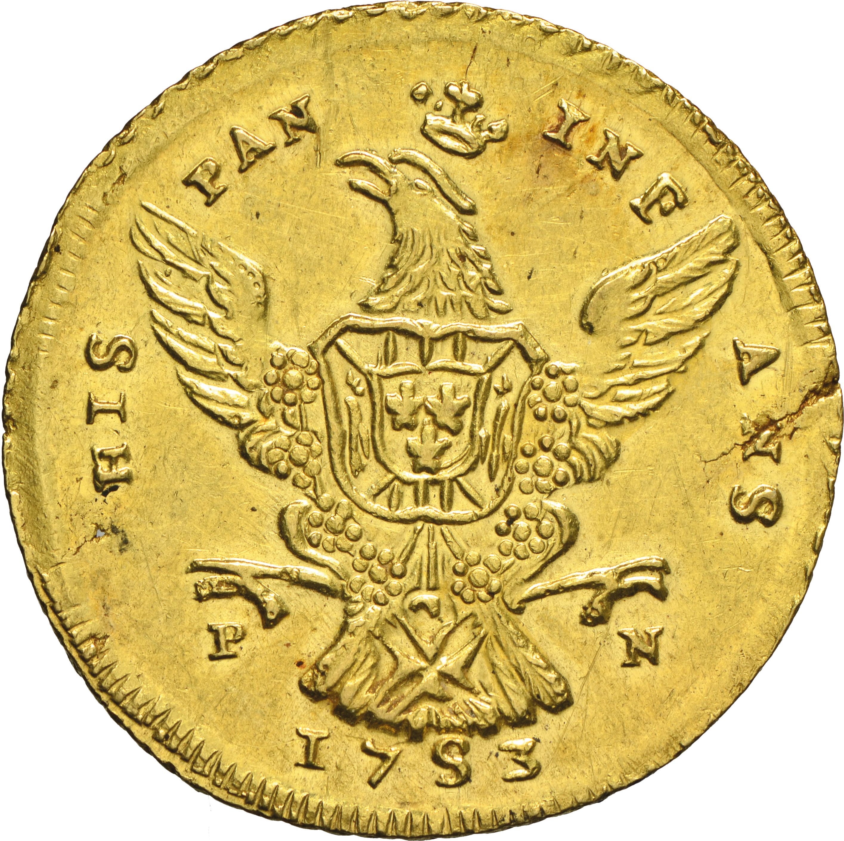 Dritto: Busto ammantato del re volto a d., con testa nuda e capelli fluenti. Campo monetale delimitato da filetto dentellato. Rovescio: Aquila coronata ad ali spiegate con testa volta a s., caricata dello scudo di Sicilia al centro del quale è lo scudetto di Borbone. Sotto gli artigli, P - N; in basso, 1753. Campo monetale delimitato da filetto dentellato
