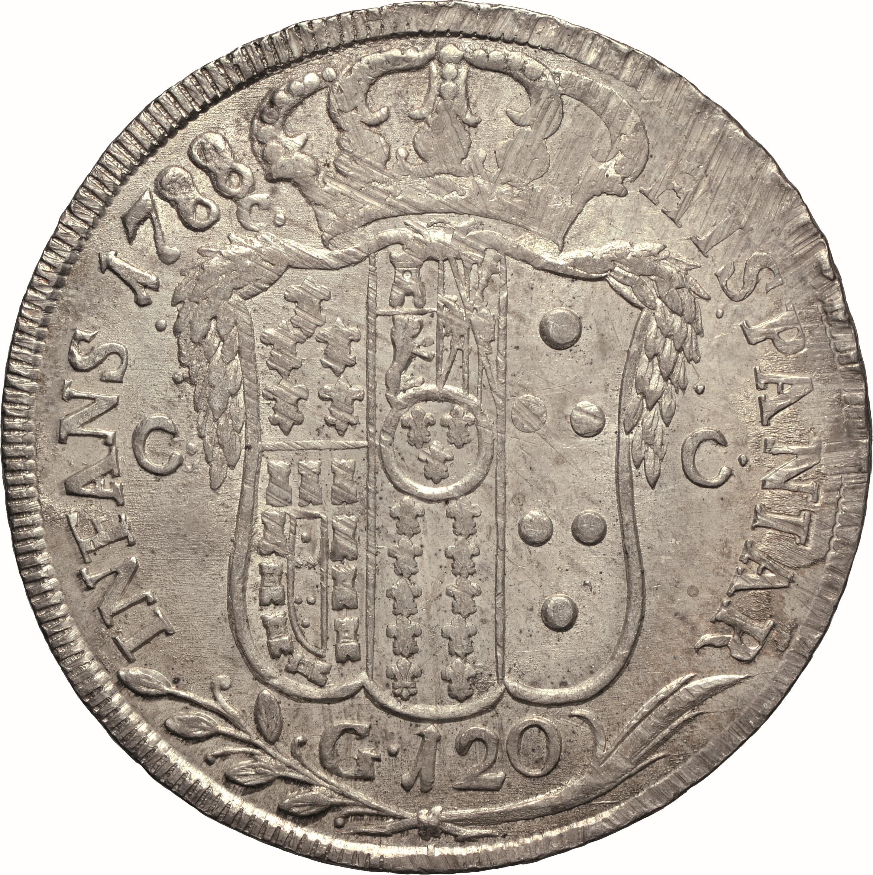 Dritto: Busto adulto del re volto a d., corazzato e a testa nuda con lunghi capelli sciolti; sotto, D. P. . Campo monetale delimitato da filetto dentellato. Rovescio: Scudo sagomato coronato, in cartella semplice ma ornata da festoni pendenti, interzato in palo: nel 1°, troncato di Farnese e di Portogallo; nel 2°, troncato: in a), partito, in 1, di Castiglia e León, in 2, di Sicilia, in b), di Angiò; nel 3°, di Medici; nel centro, scudetto di Borbone. Nel campo, in alto a s., C.; al centro, C. / C.; sotto lo scudo, tra rami di alloro e di palma, G∙ 120. Campo monetale delimitato da filetto dentellato. T/ treccia