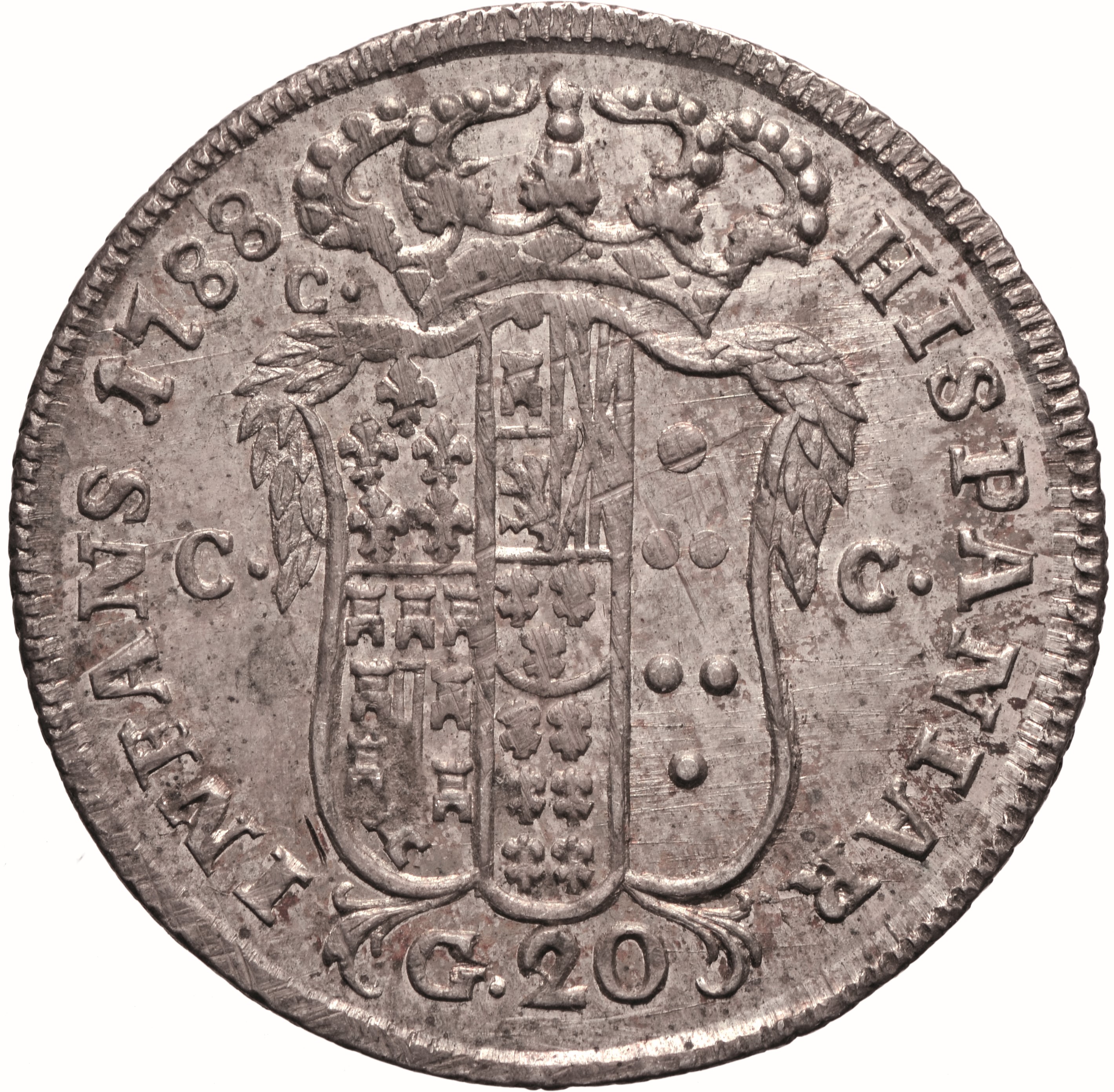 Dritto: Busto adulto del re volto a d., corazzato e a testa nuda con lunghi capelli sciolti; sotto, P. Campo monetale delimitato da filetto dentellato. Rovescio: Scudo sagomato coronato, in cartella semplice ma ornata da festoni pendenti, interzato in palo: nel 1°, troncato di Farnese e di Portogallo; nel 2°, troncato: in a), partito, in 1, di Castiglia e León, in 2, di Sicilia, in b), di Angiò; nel 3°, di Medici; nel centro, scudetto di Borbone. Nel campo, in alto a s., C.; al centro, C. / C.; sotto lo scudo, tra decori vegetali, G. 20. Campo monetale delimitato da filetto dentellato. T/ cordone
