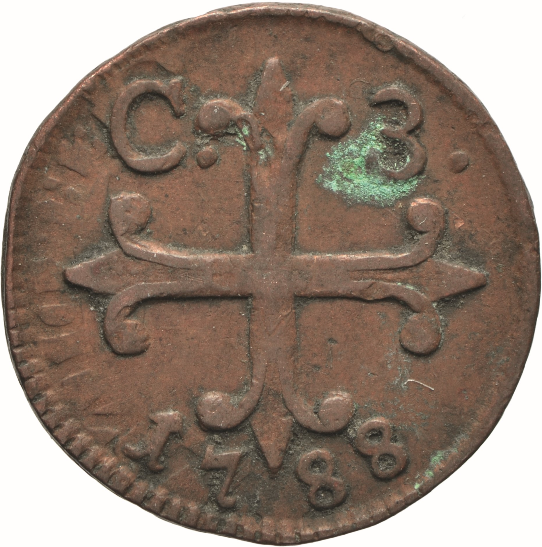 Dritto: Testa nuda del re volta a destra, con lunghi capelli; sotto, P. . Campo monetale delimitato da filetto dentellato. Rovescio: Croce gigliata. Campo monetale delimitato da filetto dentellato. T/ liscio