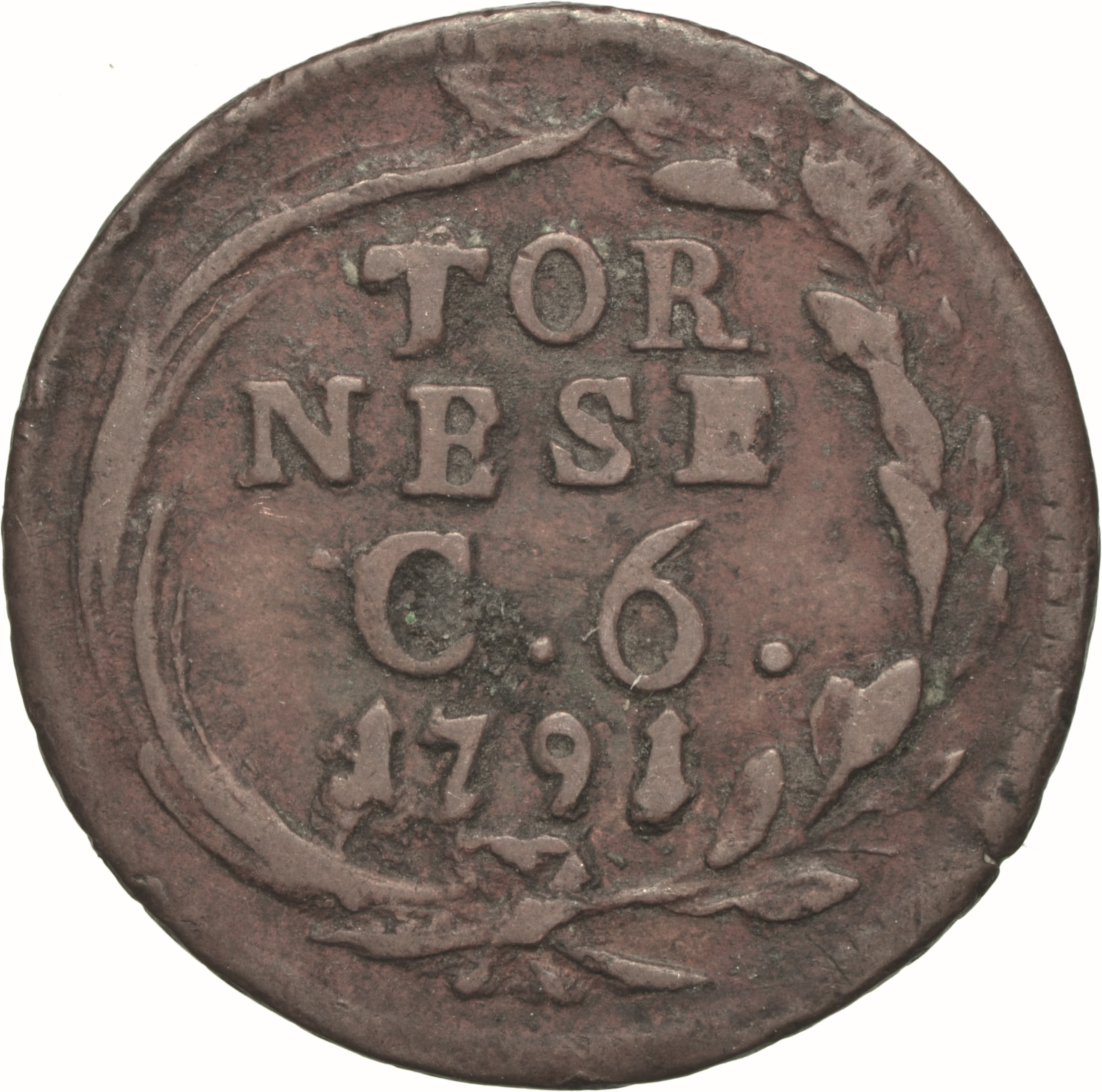 Dritto: Testa nuda del re volta a destra, con lunghi capelli; sotto, P. . Campo monetale delimitato da filetto dentellato. Rovescio: Rami di palma e di alloro annodati. Campo monetale delimitato da filetto dentellato. T/ treccia
