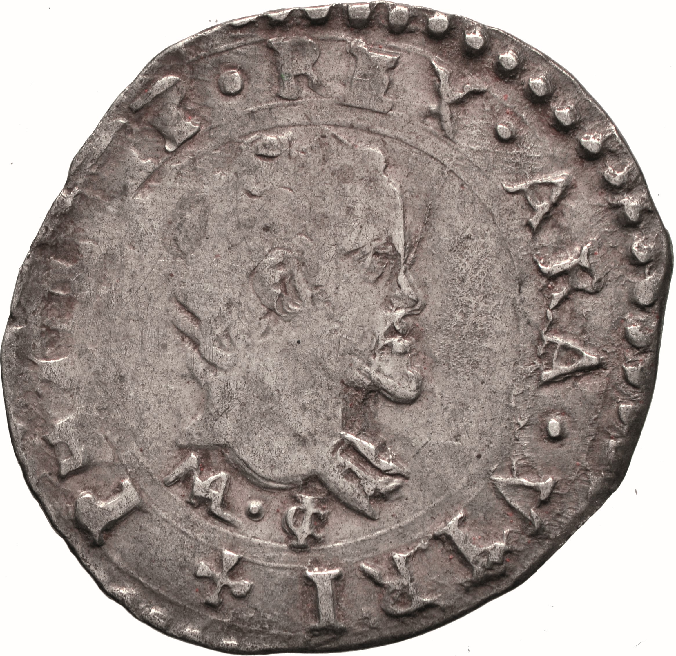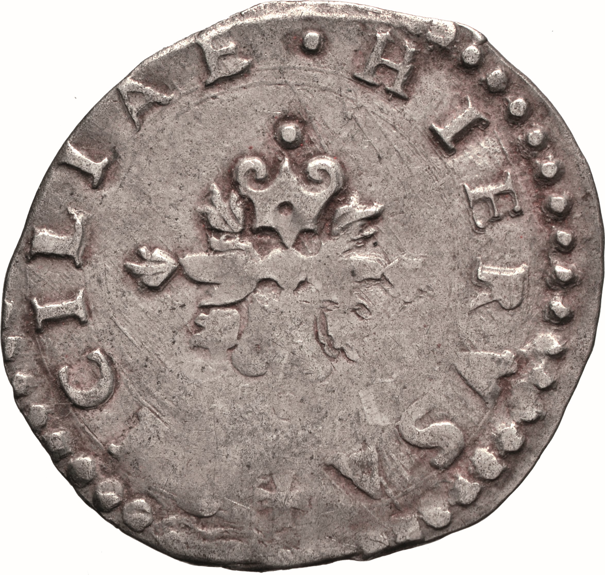 Dritto: Testa del re, radiata e barbata, volta a d., con drappeggio sulla spalla sinistra; sotto, (in legatura) MAL ∙ C͜I. Campo monetale delimitato da filetto perlinato. Rovescio: Due acciarini sormontati da globetti e due fiamme sormontate da fiammelle disposti in croce intorno a un globo; negli angoli, fiammelle minori. Campo monetale delimitato da filetto perlinato