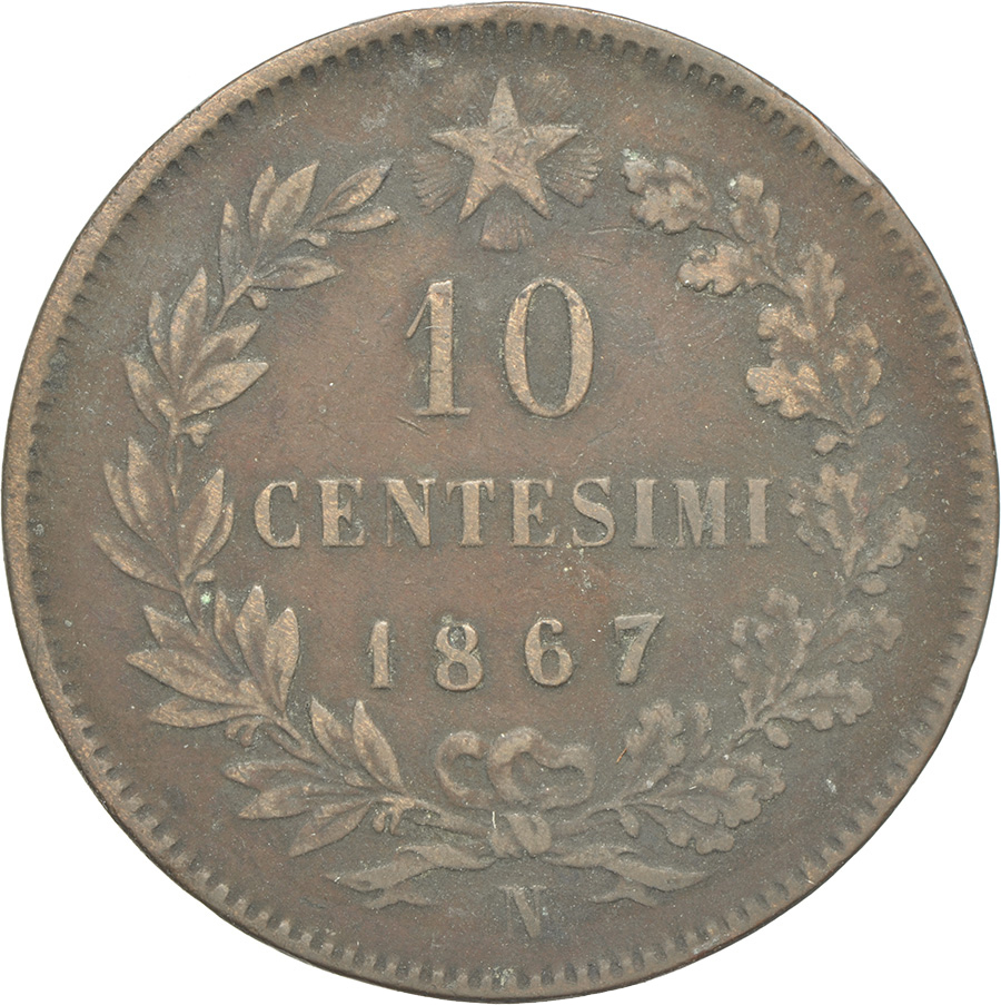 Dritto: Testa nuda del re volta a s.; sotto, FERRARIS. Campo monetale delimitato da cornice dentellata. Rovescio: Nel campo, tra rami di lauro e di quercia legati in basso: 10 | CENTESIMI | 1867; in alto una stella raggiante; in basso, N. Campo monetale delimitato da cornice dentellata