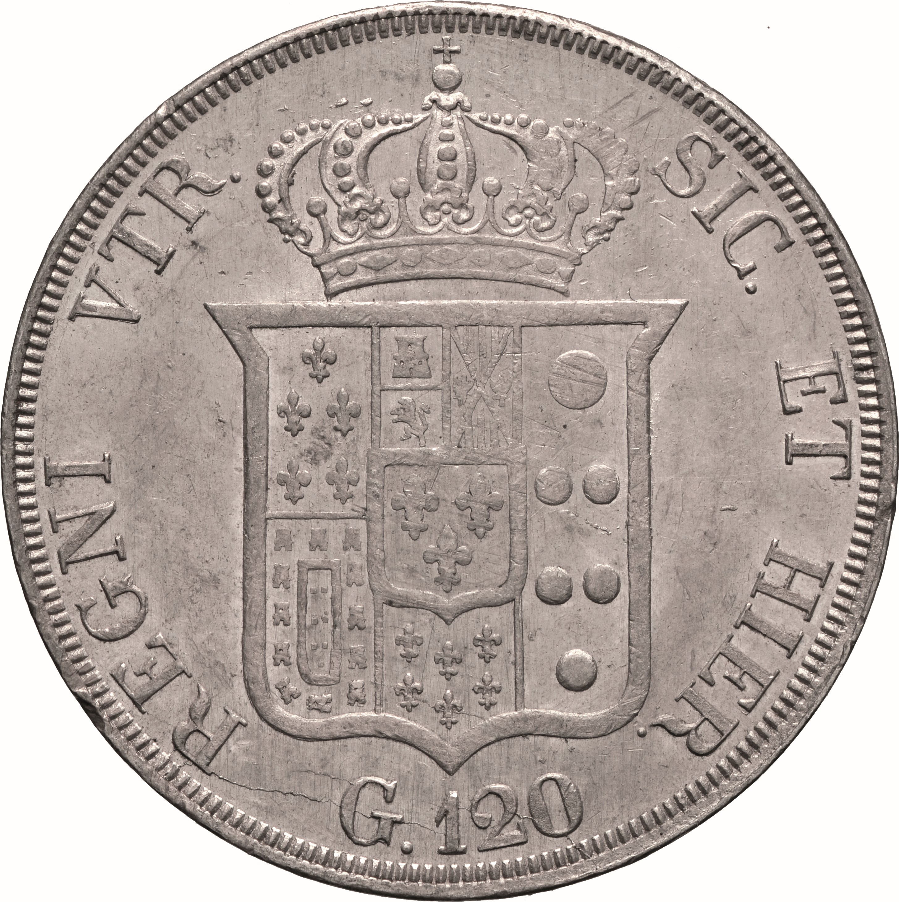 Dritto: Testa nuda giovanile del re volta a d.; sotto, 1831. Campo monetale delimitato da cornice liscia e filetto dentellato. Rovescio: Scudo coronato, in cartella semplice, interzato in palo: nel 1°, troncato di Farnese e di Portogallo; nel 2°, troncato: in a), partito, in 1, di Castiglia e León, in 2, di Sicilia, in b), di Angiò; nel 3°, di Medici; nel centro, scudetto di Borbone; sotto, nel giro della legenda, G. 120. Campo monetale delimitato da cornice con filetto dentellato