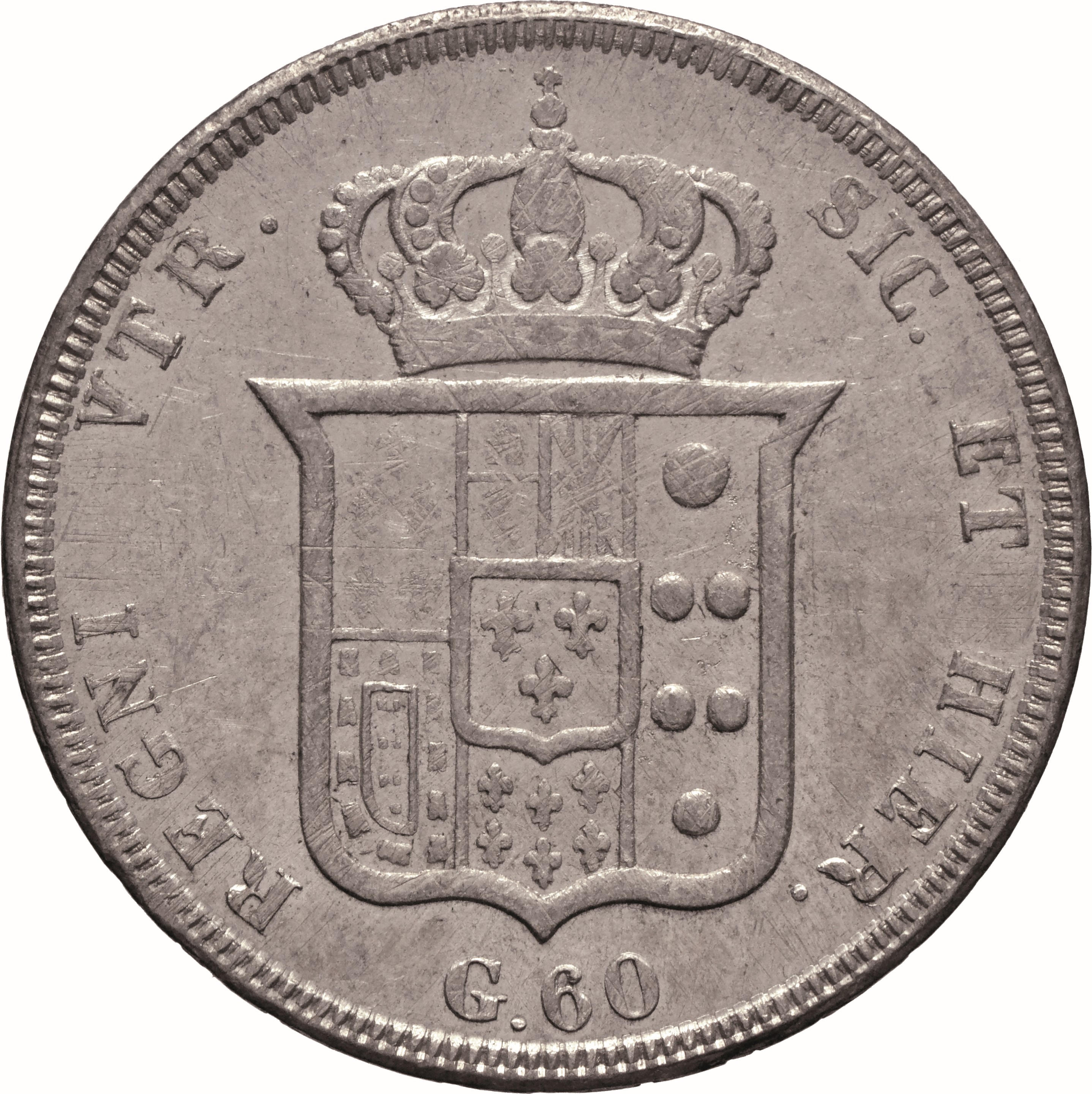 Dritto: Testa nuda giovanile del re volta a d.; sotto, 1831. Campo monetale delimitato da cornice liscia e filetto dentellato. Rovescio: Scudo coronato, in cartella semplice, interzato in palo: nel 1°, troncato di Farnese (fortemente liso) e di Portogallo; nel 2°, troncato: in a), partito, in 1, di Castiglia e León (liso), in 2, di Sicilia, in b), di Angiò; nel 3°, di Medici; nel centro, scudetto di Borbone; sotto, nel giro della legenda, G. 60. Campo monetale delimitato da cornice con filetto dentellato