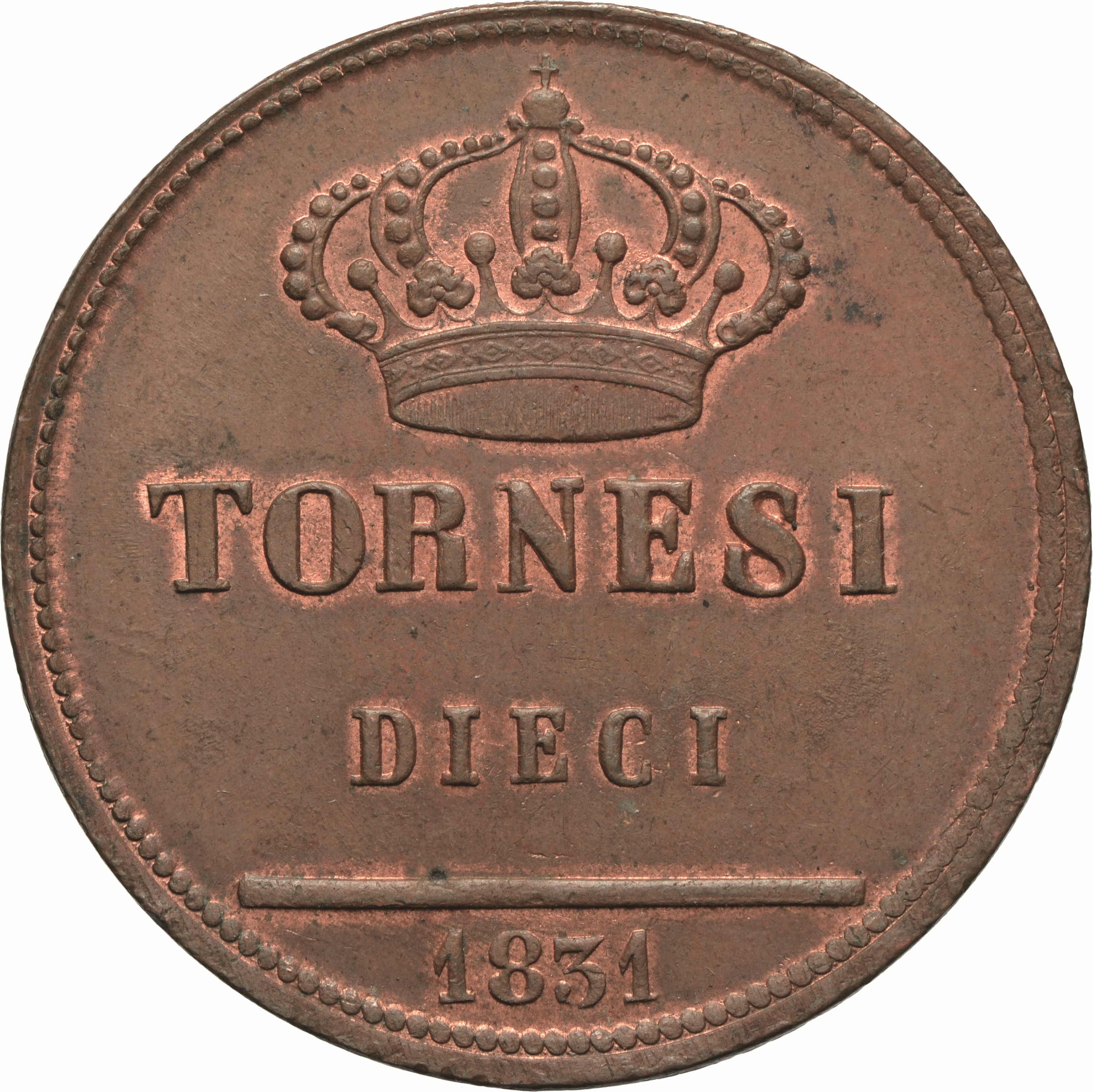 Dritto: Testa nuda giovanile del re volta a d.; sotto, ★. Campo monetale delimitato da cornice liscia e filetto perlinato. Rovescio: Nel campo: corona reale | TORNESI | DIECI; in esergo, 1831. Campo monetale delimitato da cornice liscia e filetto perlinato