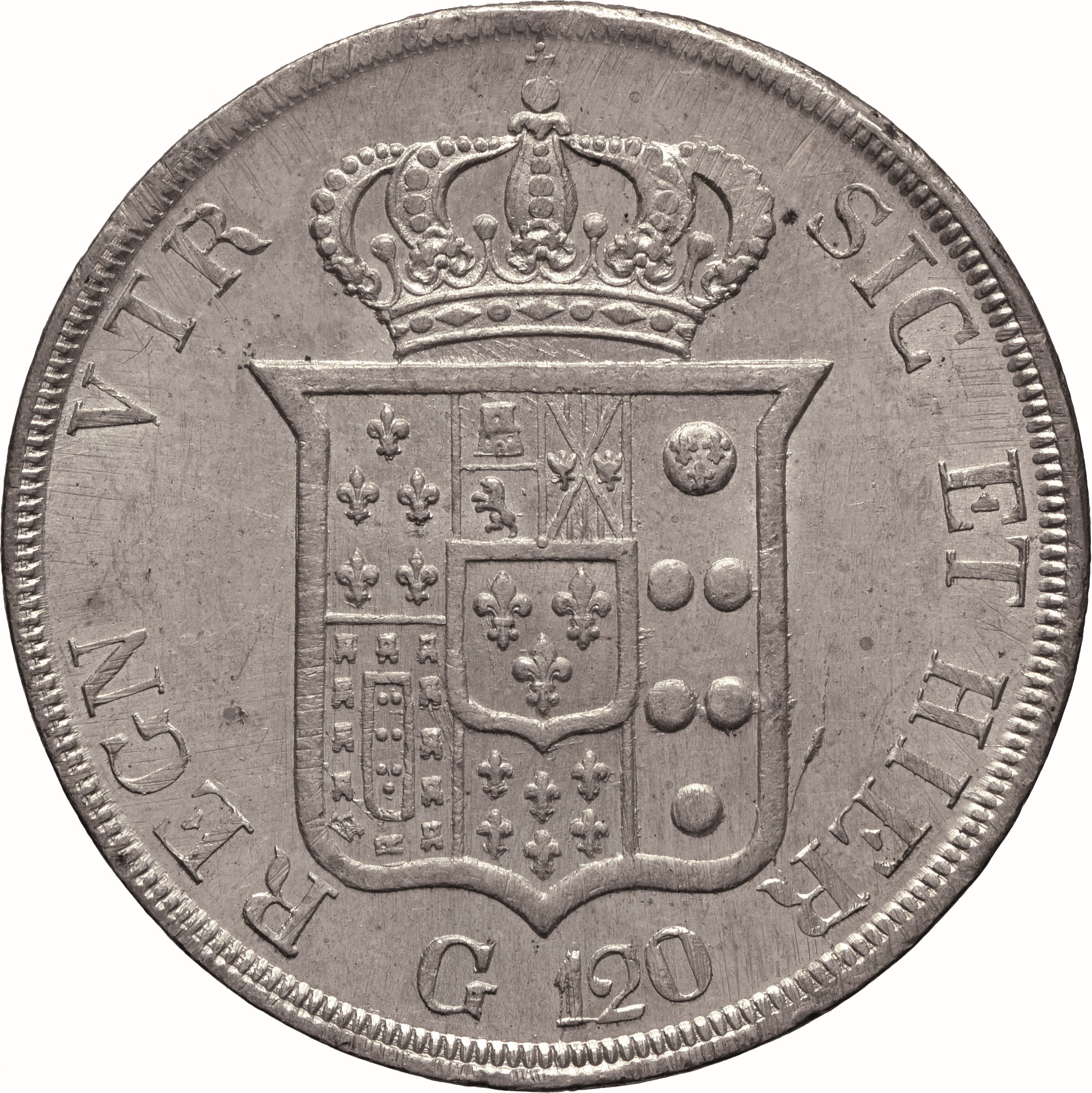 Dritto: Testa nuda giovanile del re volta a d.; sotto, 1834. Campo monetale delimitato da cornice liscia e filetto dentellato. Rovescio: Scudo coronato, in cartella semplice, interzato in palo: nel 1°, troncato di Farnese e di Portogallo; nel 2°, troncato: in a), partito, in 1, di Castiglia e León, in 2, di Sicilia, in b), di Angiò; nel 3°, di Medici; nel centro, scudetto di Borbone; sotto, nel giro della legenda, G. 120. Campo monetale delimitato da cornice con filetto dentellato