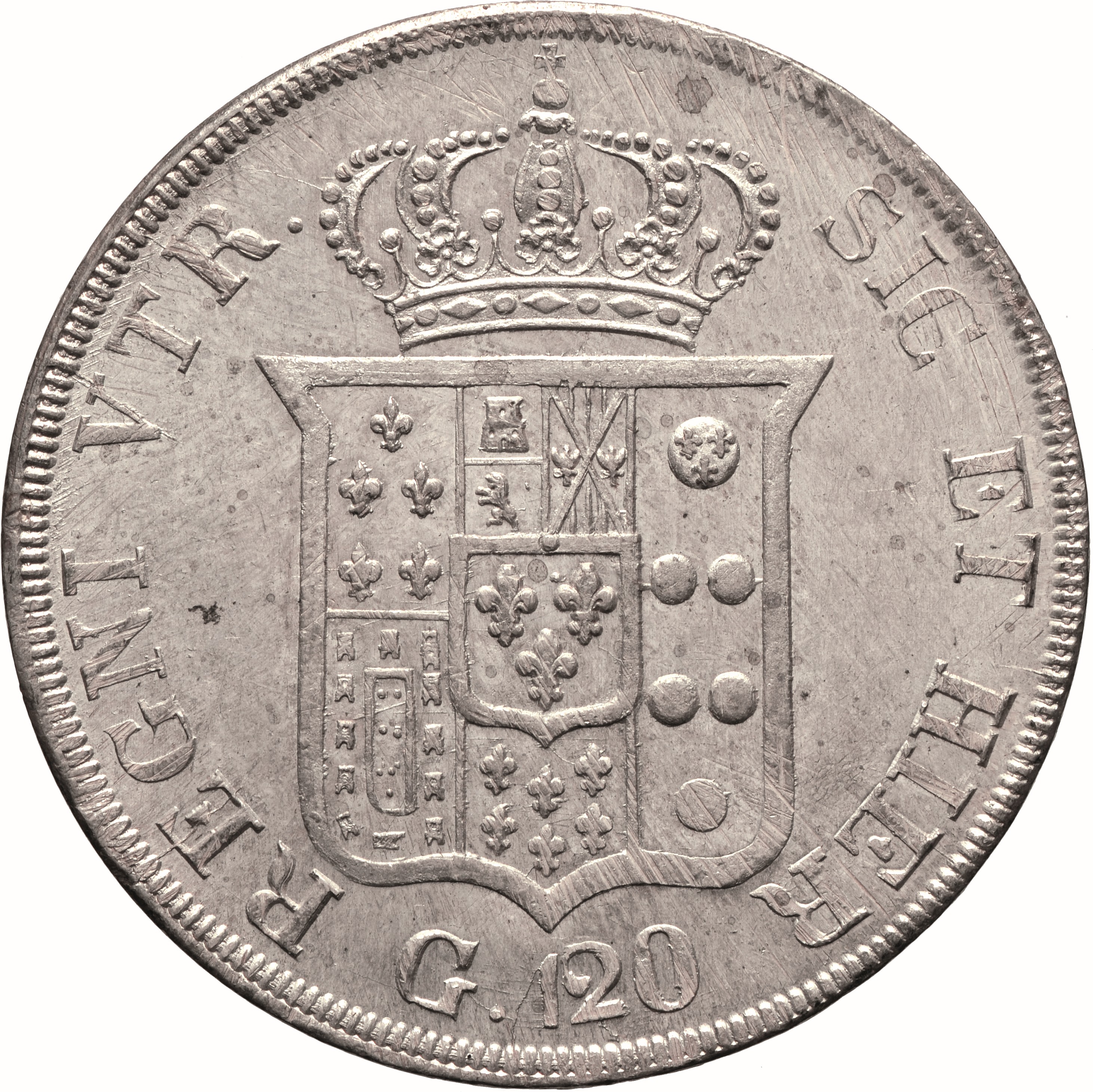 Dritto: Testa nuda giovanile del re volta a d.; sotto, 1834. Campo monetale delimitato da cornice liscia e filetto dentellato. Rovescio: Scudo coronato, in cartella semplice, interzato in palo: nel 1°, troncato di Farnese e di Portogallo; nel 2°, troncato: in a), partito, in 1, di Castiglia e León, in 2, di Sicilia, in b), di Angiò; nel 3°, di Medici; nel centro, scudetto di Borbone; sotto, nel giro della legenda, G. 120. Campo monetale delimitato da cornice con filetto dentellato