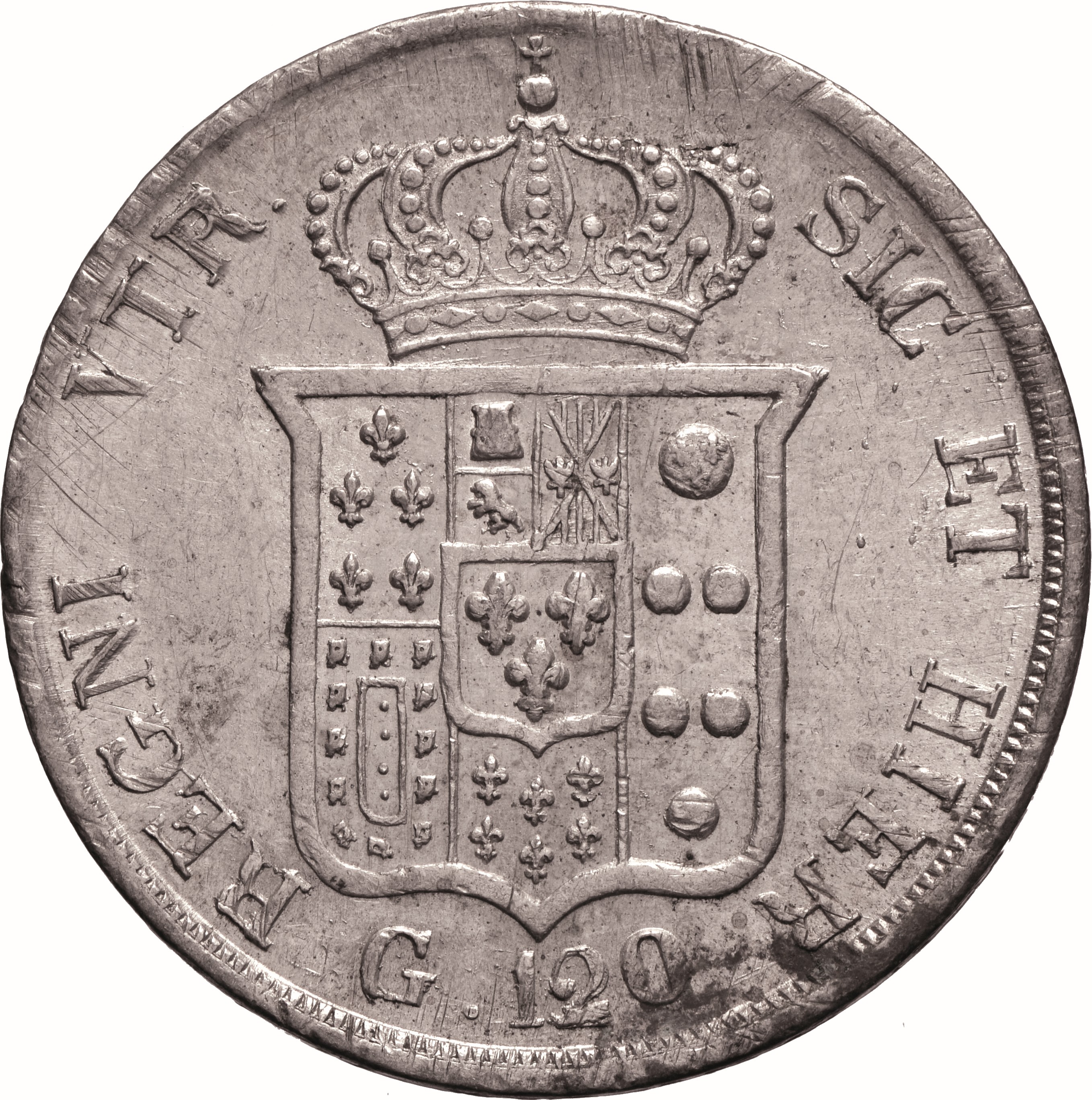 Dritto: Testa nuda giovanile del re volta a d.; sotto, 1834. Campo monetale delimitato da cornice liscia e filetto dentellato. Rovescio: Scudo coronato, in cartella semplice, interzato in palo: nel 1°, troncato di Farnese e di Portogallo; nel 2°, troncato: in a), partito, in 1, di Castiglia e León, in 2, di Sicilia, in b), di Angiò; nel 3°, di Medici; nel centro, scudetto di Borbone; sotto, nel giro della legenda, G. 120. Campo monetale delimitato da cornice con filetto dentellato