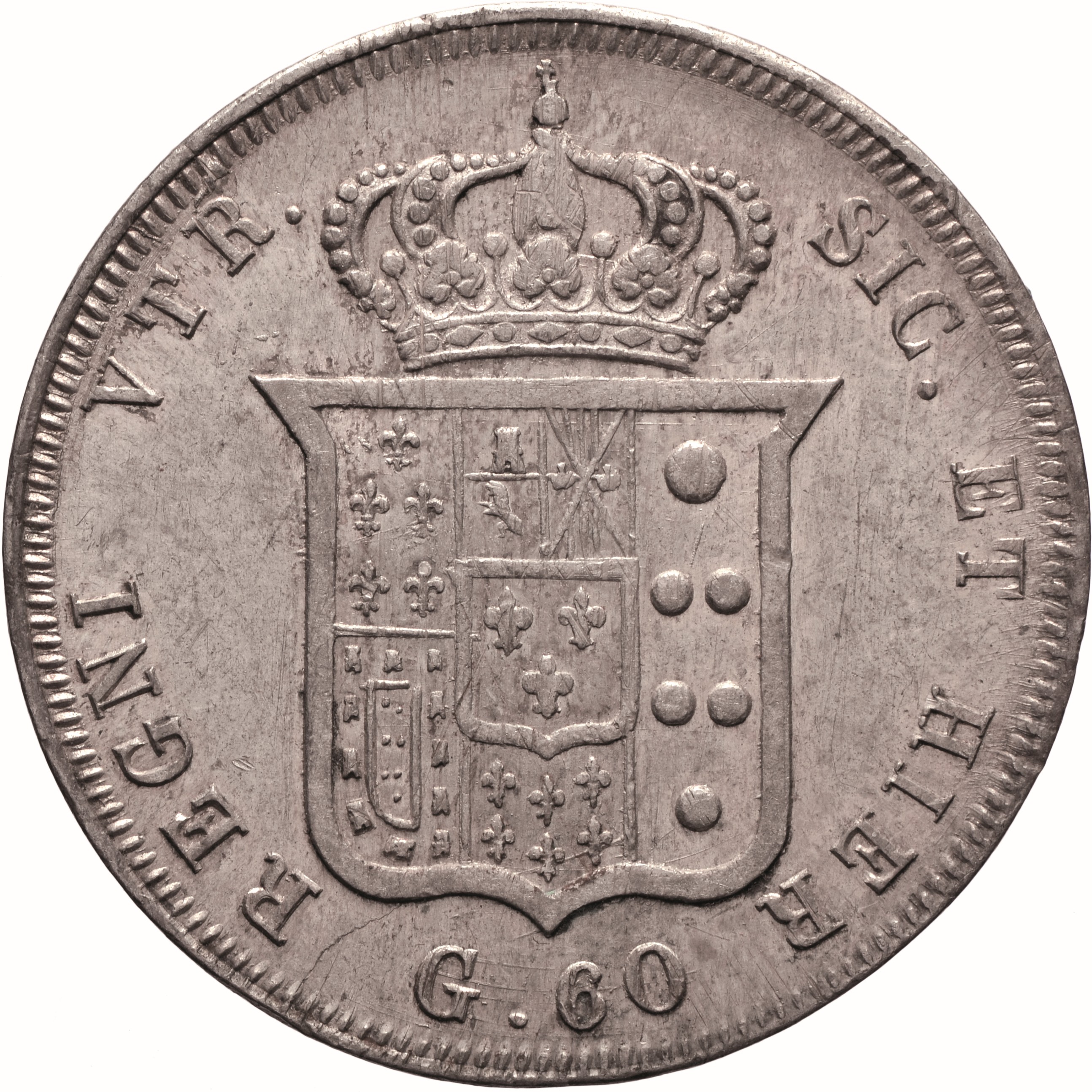 Dritto: Testa nuda giovanile del re volta a d.; sotto, 1834. Campo monetale delimitato da cornice liscia e filetto dentellato. Rovescio: Scudo coronato, in cartella semplice, interzato in palo: nel 1°, troncato di Farnese e di Portogallo; nel 2°, troncato: in a), partito, in 1, di Castiglia e León, in 2, di Sicilia, in b), di Angiò; nel 3°, di Medici; nel centro, scudetto di Borbone; sotto, nel giro della legenda, G. 60. Campo monetale delimitato da cornice con filetto dentellato