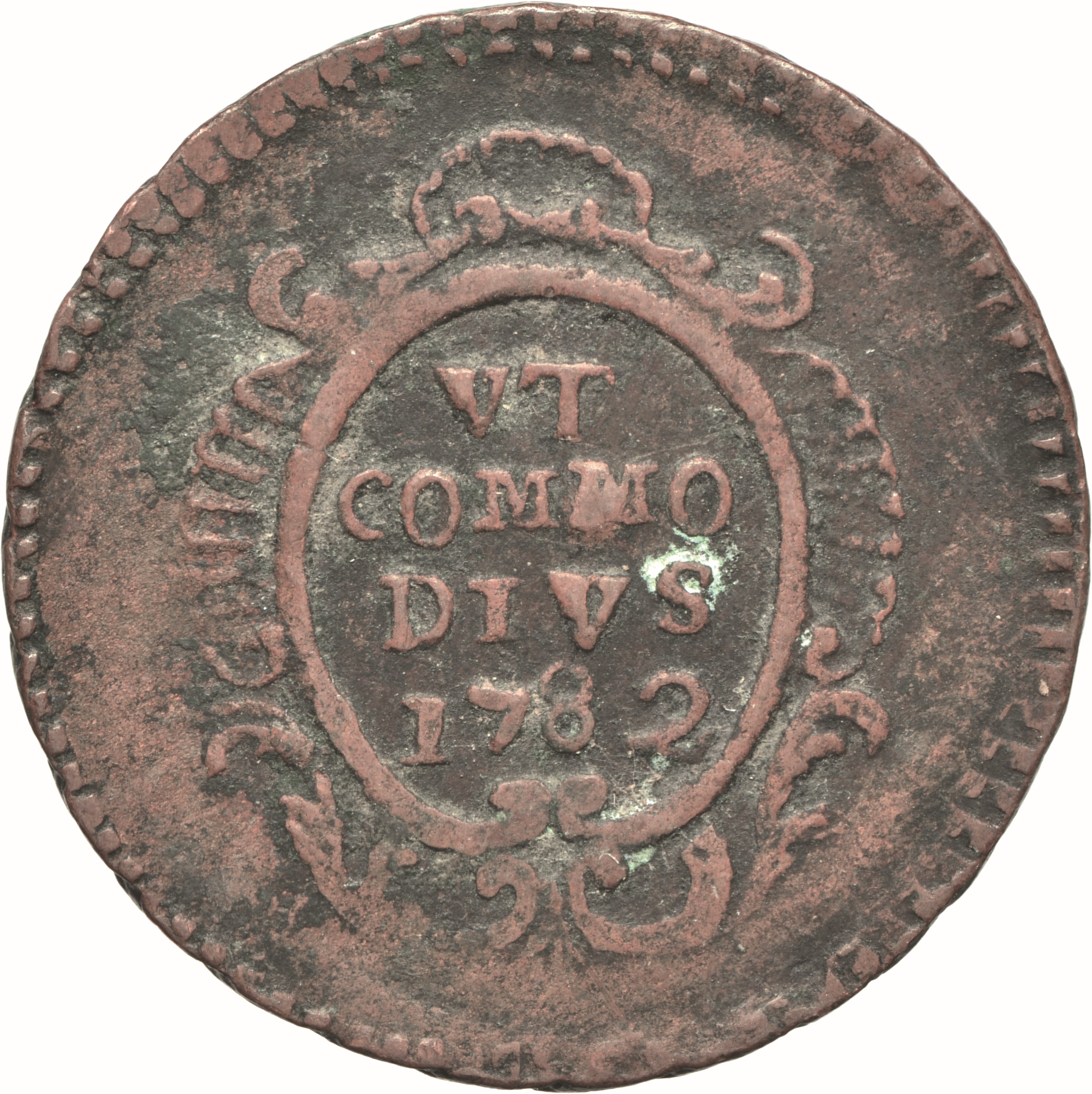 Dritto: Aquila coronata ad ali spiegate, con testa volta a s.; sotto le ali, G ∙ L ∙ - C ∙; sotto gli artigli, due croci. Campo monetale delimitato da filetto dentellato. Rovescio: In cartella ornata a cartocci, VT | COMMO|DIVS | 1782. Campo monetale delimitato da filetto dentellato