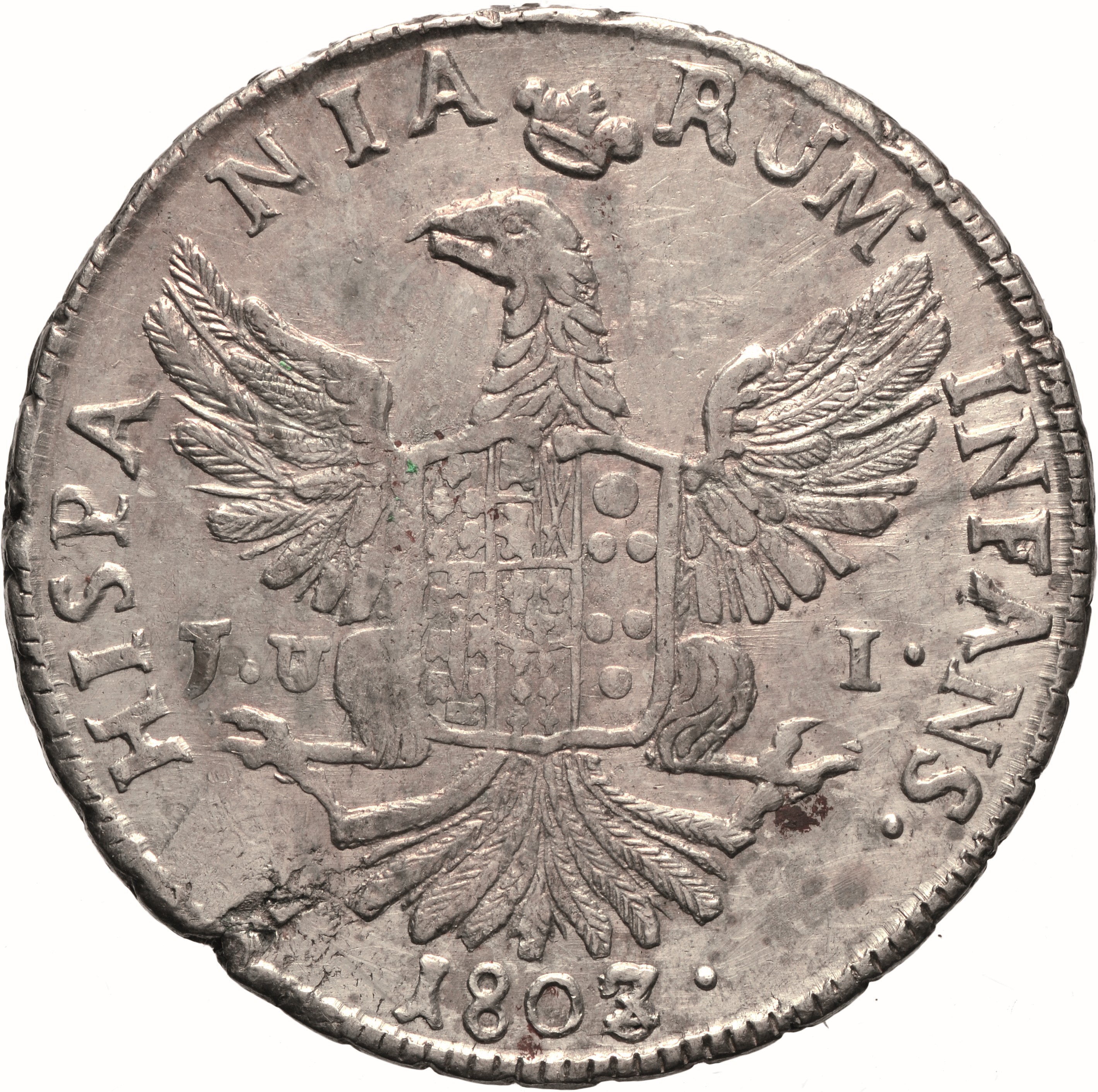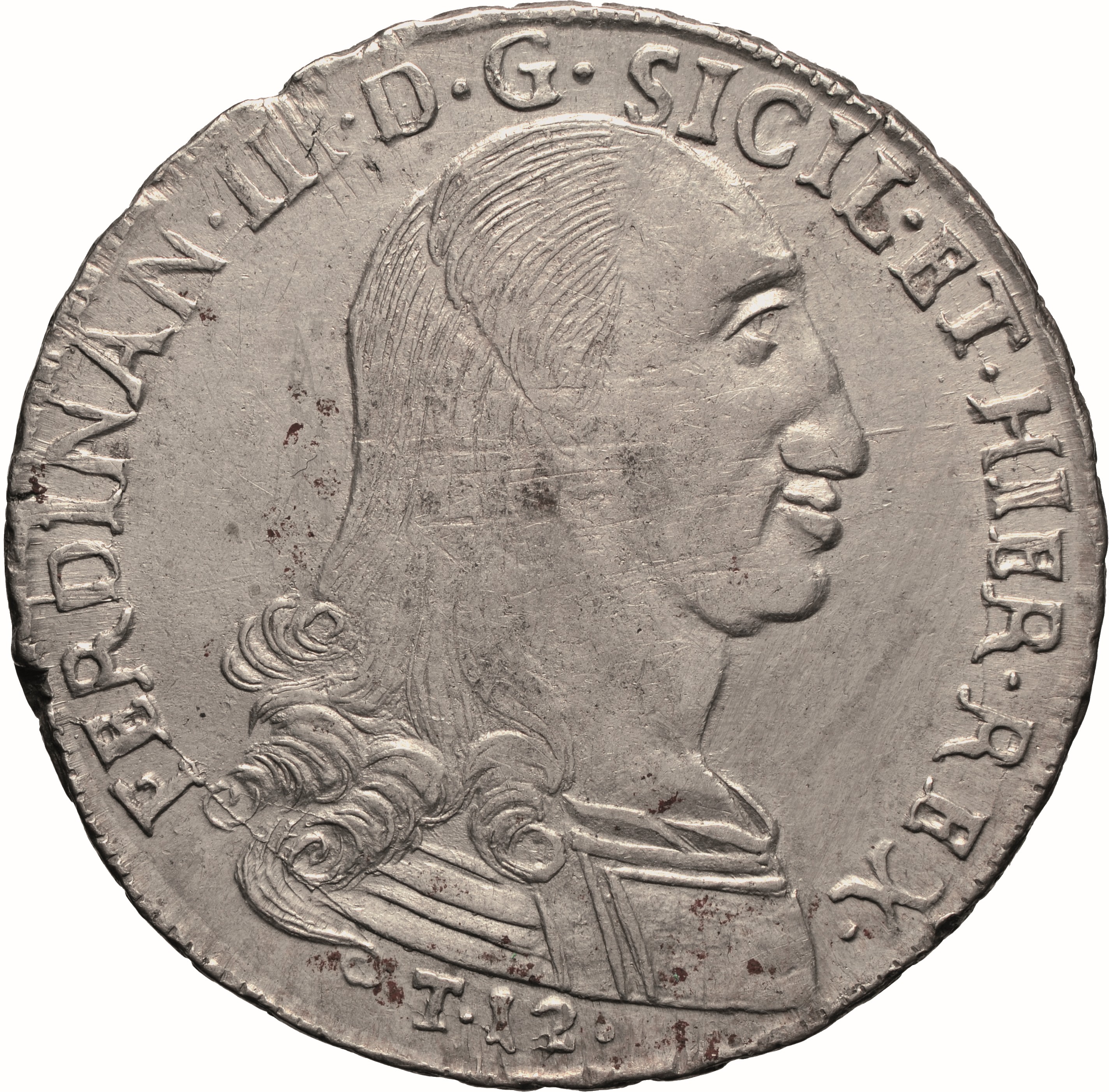 Dritto: Busto corazzato del re volto a d., a testa nuda con lunghi capelli; sotto, T ∙ 12 ∙. Campo monetale delimitato da filetto dentellato. Rovescio: Aquila coronata ad ali spiegate, con testa volta a s., caricata da scudo interzato in palo: nel 1°, troncato di Farnese e di Portogallo; nel 2°, troncato: in a), partito, in 1, di Castiglia e León, in 2, di Sicilia, in b), di Angiò; nel 3°, di Medici; nel centro, scudetto di Borbone. Nel campo, sotto le ali, J. U - I.; in basso 1803∙. Campo monetale delimitato da filetto dentellato