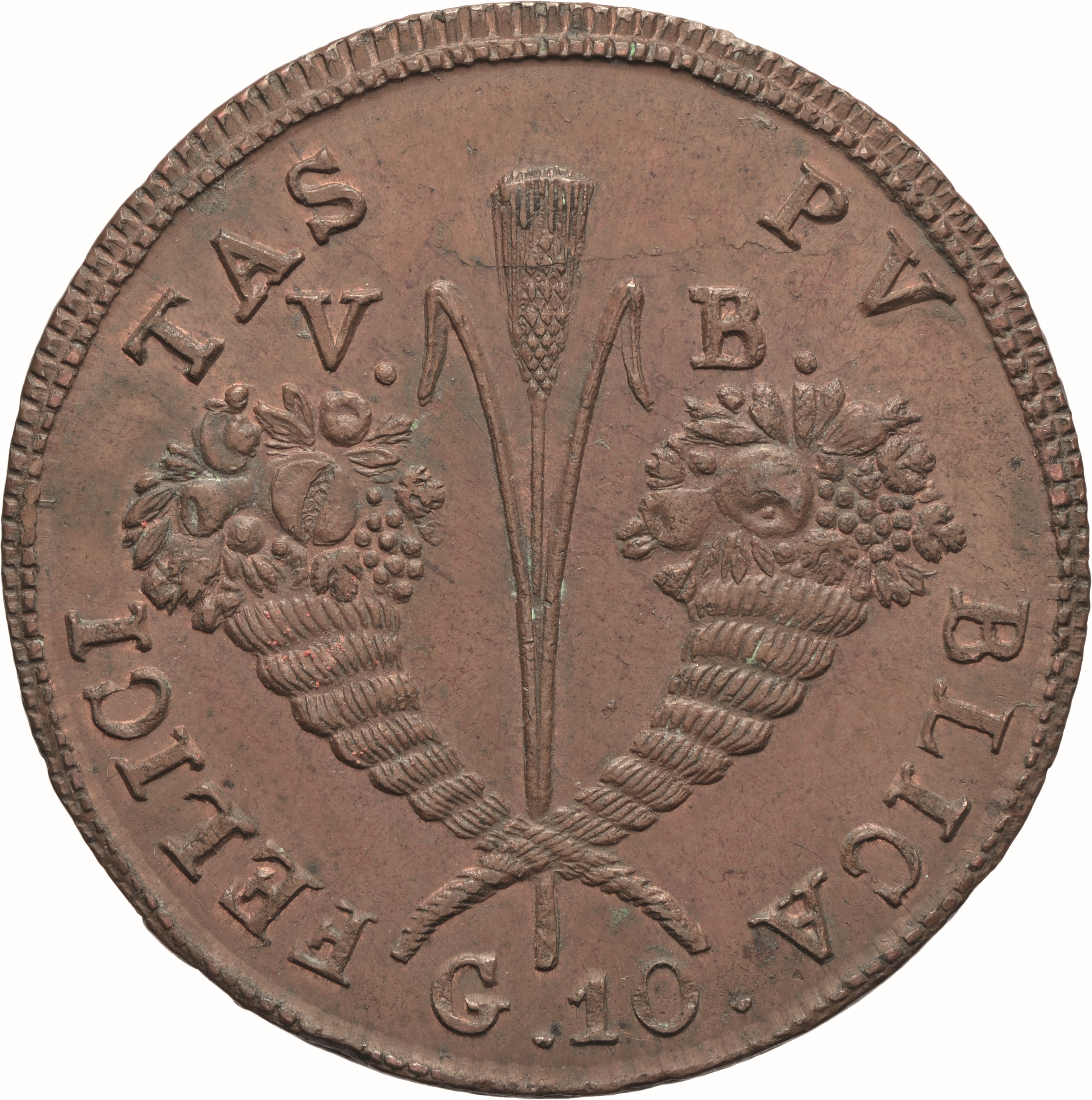 Dritto: Testa coronata del re volta a d.; sotto, 1814. . Campo monetale delimitato da filetto dentellato. Rovescio: Due cornucopie decussate; al centro, una spiga di grano; sotto, G. 10.; nel campo in alto, V. / B. . Campo monetale delimitato da filetto dentellato