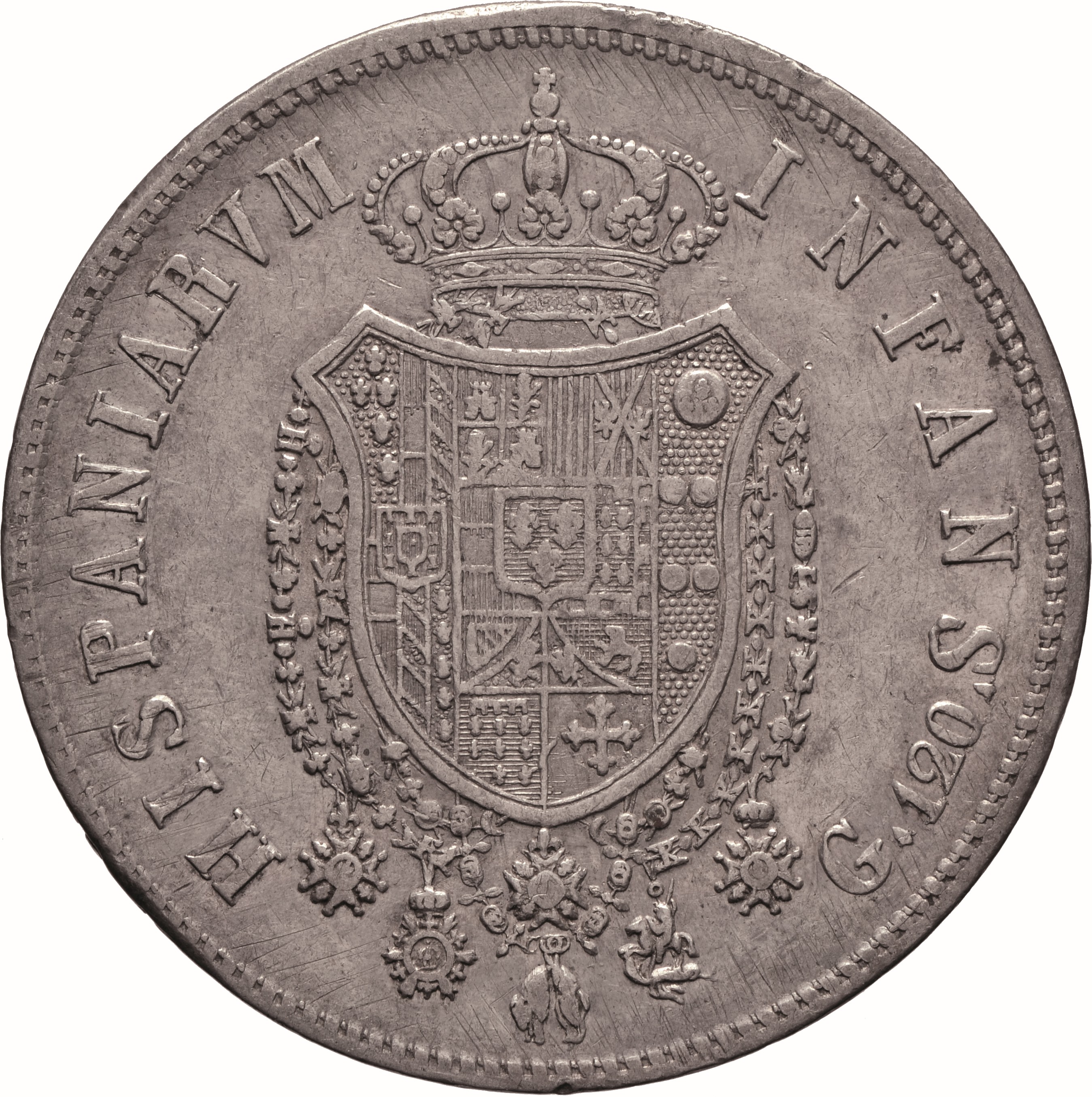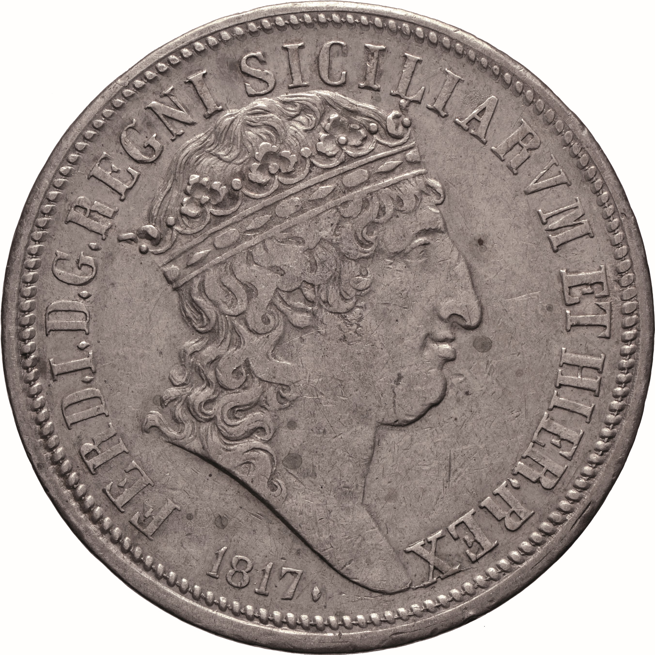 Dritto: Testa coronata del re volta a d., con lunghi capelli ricci; sotto, 1817♦. Campo monetale delimitato da cornice con filetto dentellato. Rovescio: Scudo sagomato in cartella semplice, coronato e cinto dai collari degli Ordini di 1) Spirito Santo, 2) san Gennaro, 3) Carlo III, 4) san Ferdinando e del merito, 5) Costantiniano di san Giorgio, 6) Toson d’oro, interzato in palo: nel 1°, troncato, in a) interzato in palo, di 1, Farnese, 2, Austria, 3, Borgogna Antica; in b), interzato in palo, di 1, Austria, 2, Borgogna Antica, 3, Farnese; sul tutto, scudetto di Portogallo. Nel 2°, interzato in fascia, in a), partito, 1), inquartato di Castiglia e León con sulla base l’arme di Granada, 2), contropartito di Aragona e di Sicilia; in b), partito di Austria e Borgogna Moderna; in c), inquartato, 1) tagliato di Borgogna Antica e Fiandre, 2) trinciato di Tirolo e Brabante, 3) di Angiò, 4) di Gerusalemme; nel 3°, di Medici; nel centro, scudetto di Borbone. Nel campo, a destra, contro l’orlo, G♦ 120♦. Campo monetale delimitato da cornice con filetto dentellato