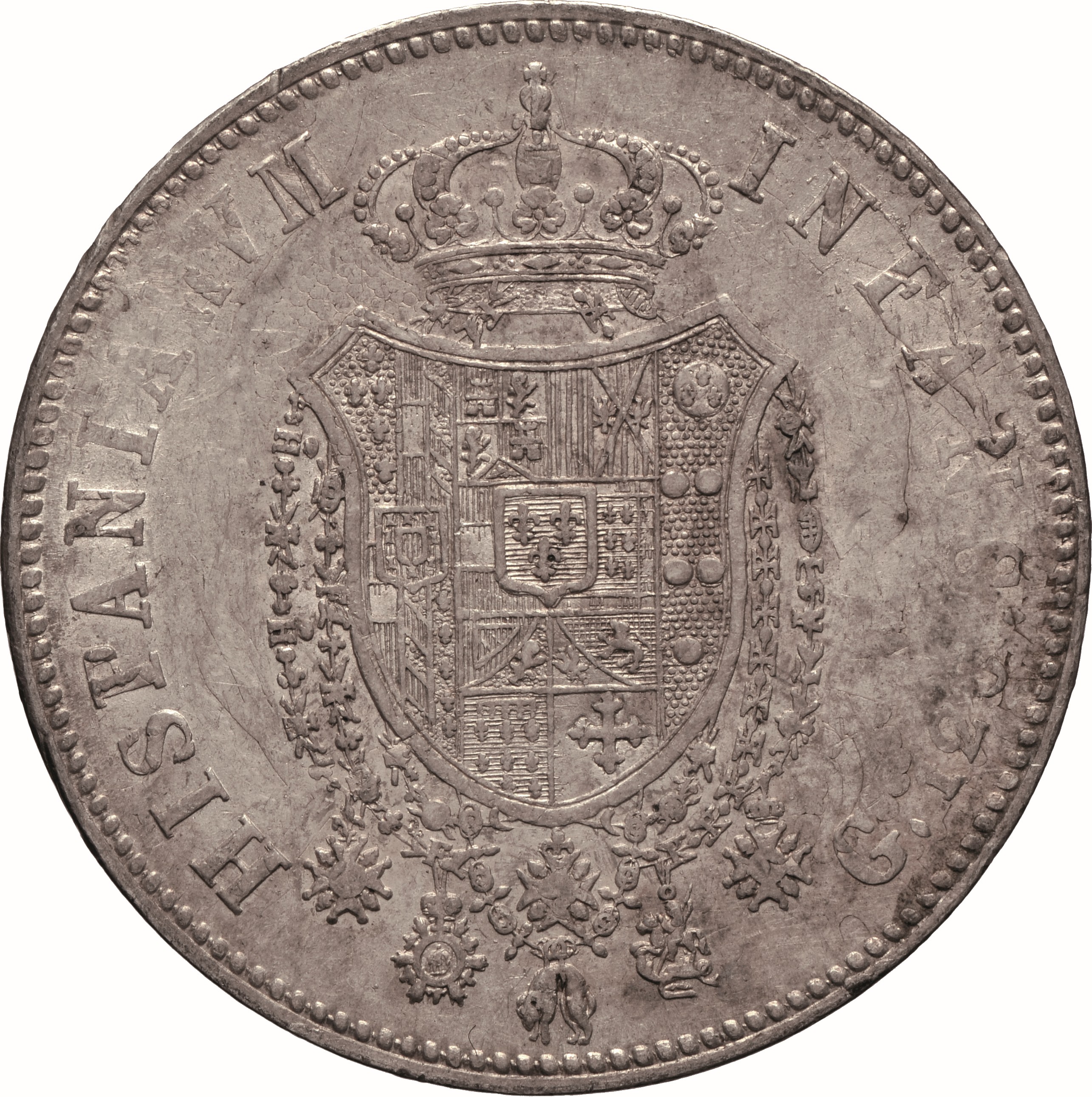Dritto: Testa coronata del re volta a d., con lunghi capelli ricci; sotto, 1818♦. Campo monetale delimitato da cornice con filetto perlinato. Rovescio: Scudo sagomato in cartella semplice, coronato e cinto dai collari degli Ordini di 1) Spirito Santo, 2) san Gennaro, 3) Carlo III, 4) san Ferdinando e del merito, 5) Costantiniano di san Giorgio, 6) Toson d’oro, interzato in palo: nel 1°, troncato, in a) interzato in palo, di 1, Farnese, 2, Austria, 3, Borgogna Antica; in b), interzato in palo, di 1, Austria, 2, Borgogna Antica, 3, Farnese; sul tutto, scudetto di Portogallo. Nel 2°, interzato in fascia, in a), partito, 1), inquartato di Castiglia e León con sulla base l’arme di Granada, 2), contropartito di Aragona e di Sicilia; in b), partito di Austria e Borgogna Moderna; in c), inquartato, 1) tagliato di Borgogna Antica e Fiandre, 2) trinciato di Tirolo e Brabante, 3) di Angiò, 4) di Gerusalemme; nel 3°, di Medici; nel centro, scudetto di Borbone. Nel campo, a destra, contro l’orlo, G♦ 120. Campo monetale delimitato da cornice con filetto perlinato