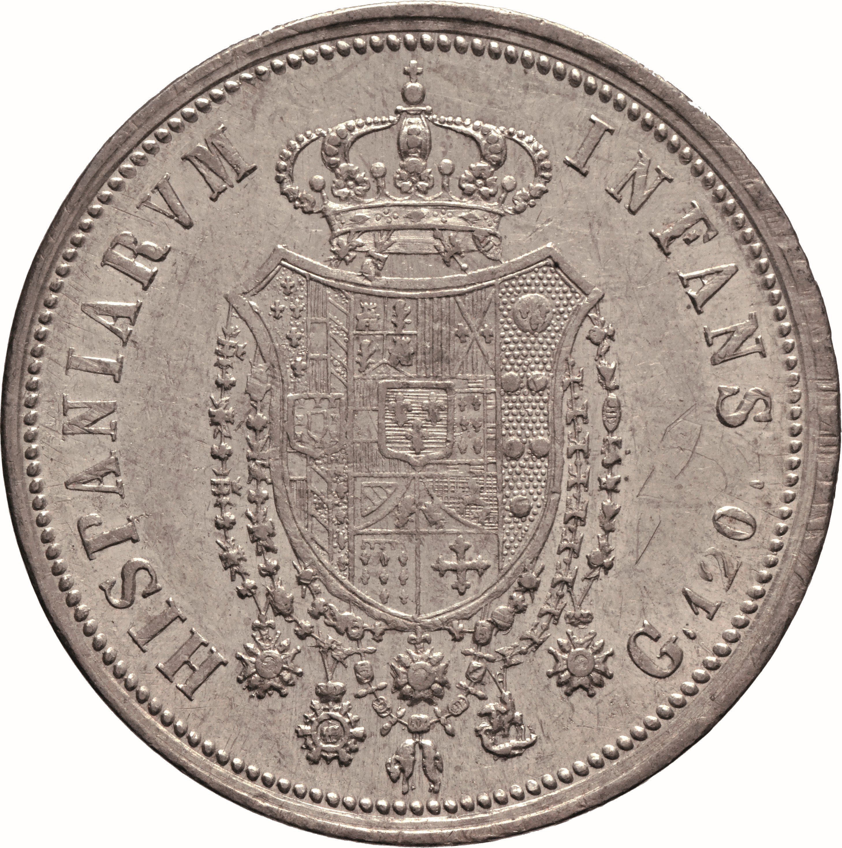 Dritto: Testa coronata del re volta a d. con lunghi capelli ricci, di dimensioni minori del tipo precedente; sotto, 1818♦. Campo monetale delimitato da cornice con filetto perlinato. Rovescio: Come precedente; nel campo, a destra, contro l’orlo, G♦ 120. Campo monetale delimitato da cornice con filetto perlinato