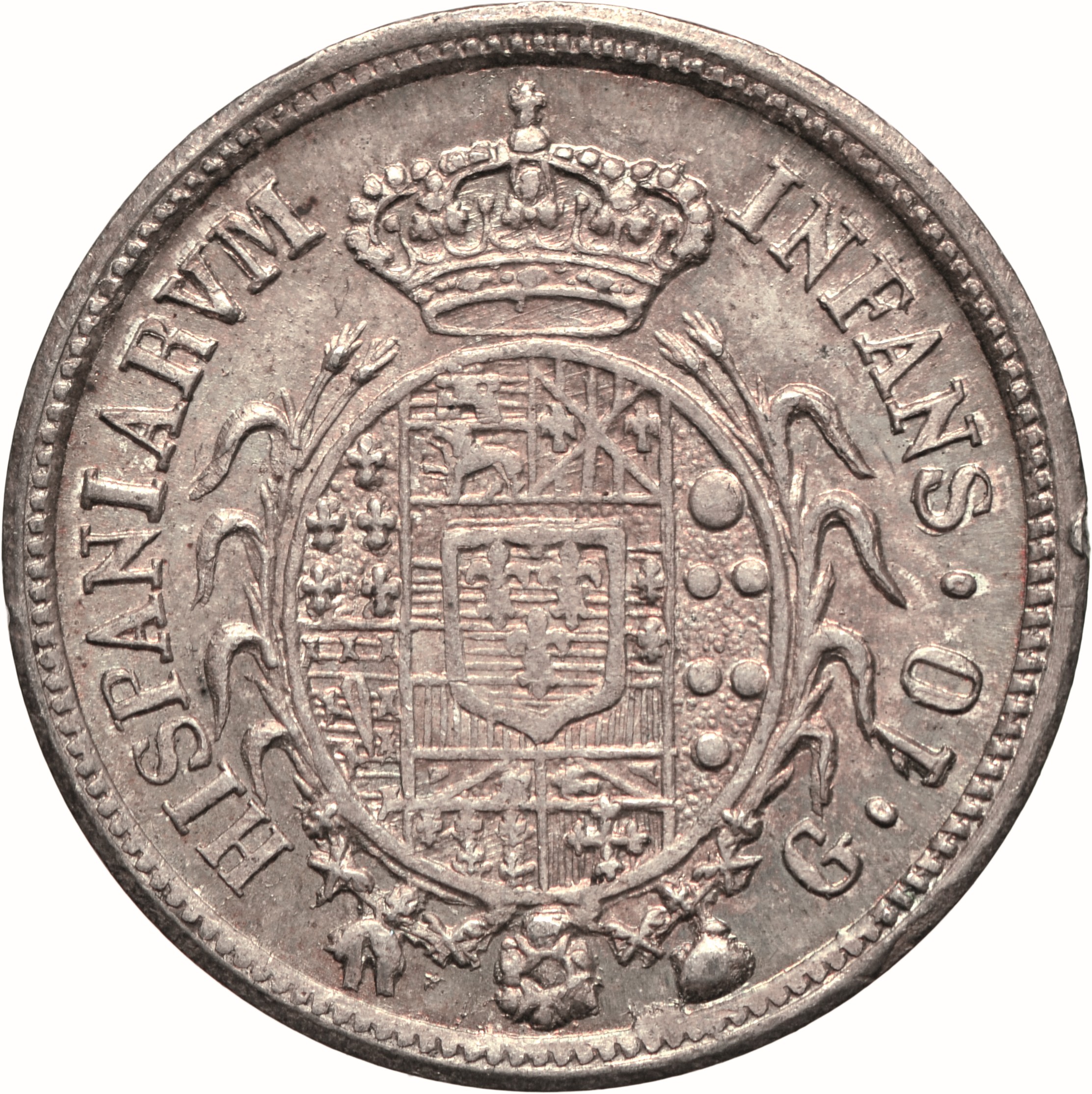 Dritto: Testa coronata del re volta a d., con lunghi capelli ricci; sotto, 1818♦. Campo monetale delimitato da cornice con filetto dentellato. Rovescio: Scudo ovale in cartella semplice, cinto da spighe dalle quali pendono i collari di Ordine del Toson d’oro, Ordine di san Ferdinando e del Merito, Ordine di Carlo III, interzato in palo: nel 1°, troncato di Farnese e Portogallo; nel 2°, interzato in fascia: in a), partito, in 1), di Castiglia e León, in 2), di Sicilia, in b), partito di Austria e Borgogna Moderna, in c), inquartato 1) tagliato di Borgogna Antica e Fiandre, 2) trinciato di Tirolo e Brabante, 3) di Angiò, 4) di Gerusalemme; nel 3°, di Medici; nel centro, scudetto di Borbone. Nel campo, a destra, contro l’orlo, G♦ 10. Campo monetale delimitato da cornice con filetto dentellato