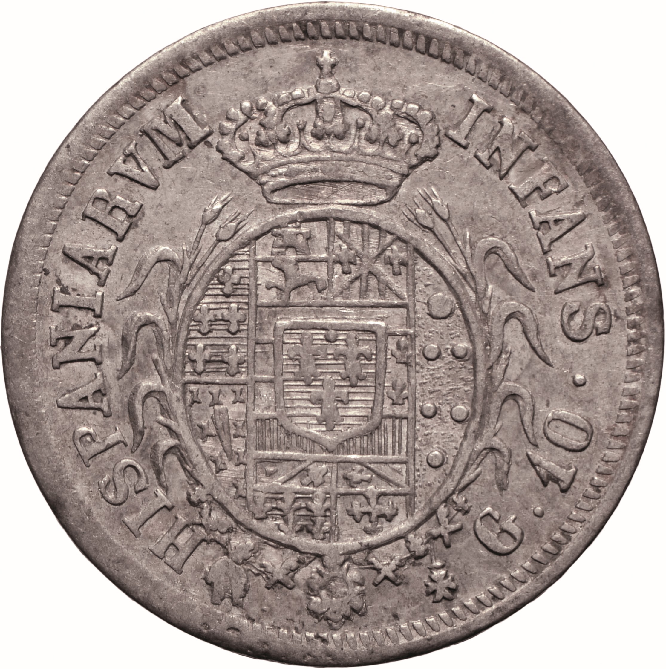 Dritto: Testa coronata del re volta a d., con lunghi capelli ricci; sotto, 1818♦. Campo monetale delimitato da cornice con filetto dentellato. Rovescio: Scudo ovale in cartella semplice, cinto da spighe dalle quali pendono i collari di Ordine del Toson d’oro, Ordine di san Ferdinando e del Merito, Ordine di Carlo III, interzato in palo: nel 1°, troncato di Farnese e Portogallo; nel 2°, interzato in fascia: in a), partito, in 1), di Castiglia e León, in 2), di Sicilia, in b), partito di Austria e Borgogna Moderna, in c), inquartato 1) tagliato di Borgogna Antica e Fiandre, 2) trinciato di Tirolo e Brabante, 3) di Angiò, 4) di Gerusalemme; nel 3°, di Medici; nel centro, scudetto di Borbone. Nel campo, a destra, contro l’orlo, G♦ 10. Campo monetale delimitato da cornice con filetto dentellato