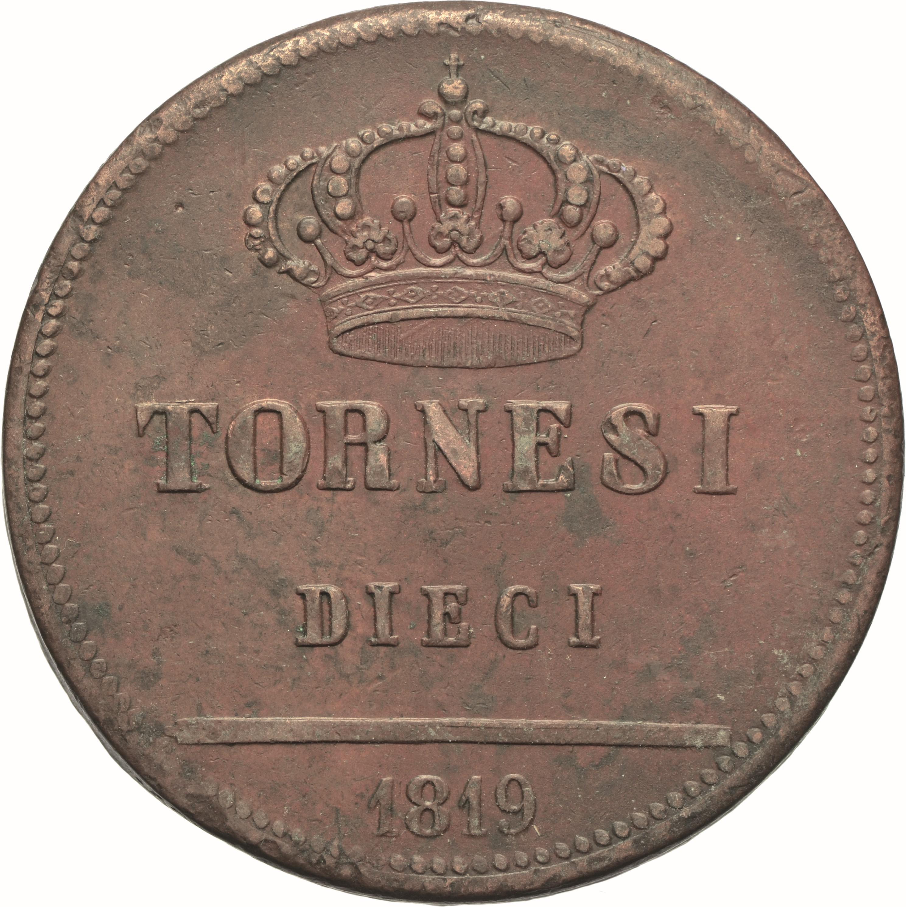 Dritto: Testa coronata del re volta a s., con lunghi capelli ricci; sotto, ✿. Campo monetale delimitato da cornice con filetto perlinato. Rovescio: Nel campo: corona reale | TORNESI | DIECI; in esergo, 1819. Campo monetale delimitato da cornice con filetto perlinato