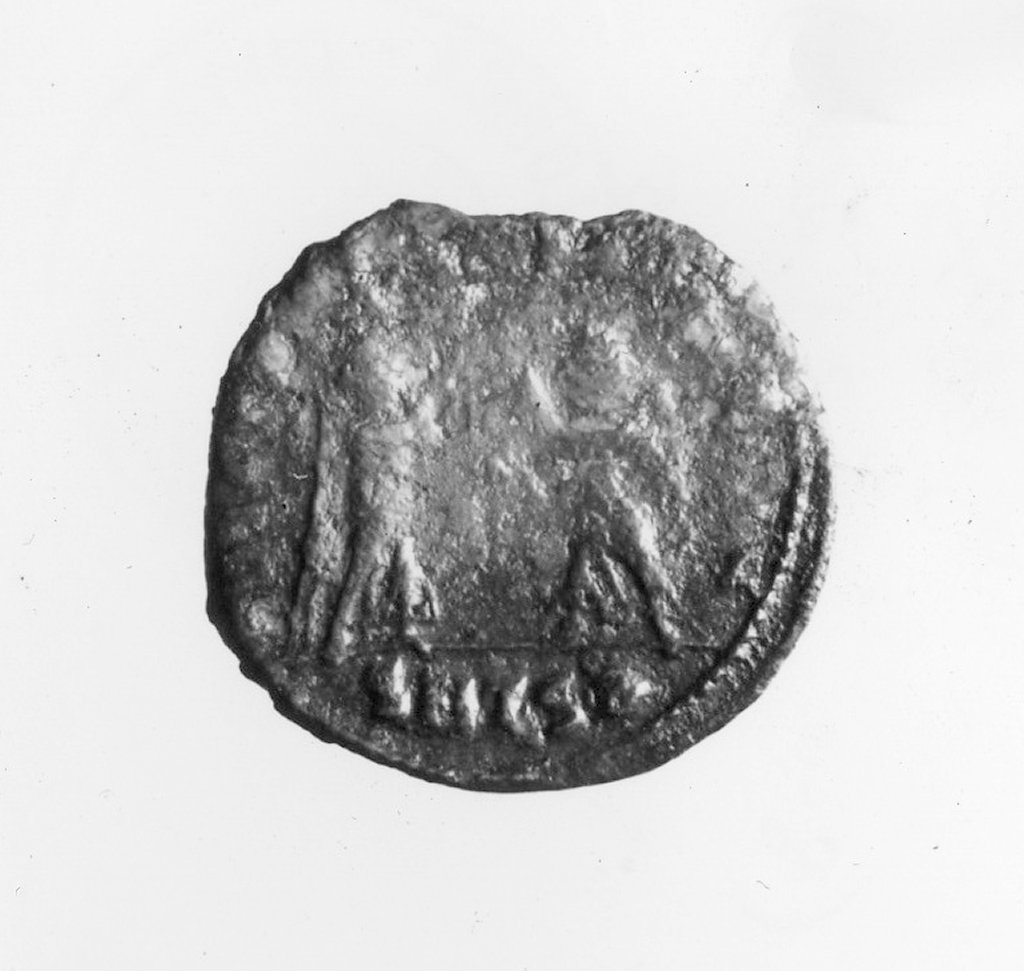 Dritto: Busto drappeggiato di Costanzo II, a d., con diadema a rosette. Rovescio: Due Vittorie incedenti verso il centro, si fronteggiano; ciascuna regge,sollevata in alto, una corona; in esergo, SMTS B