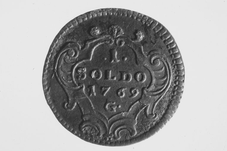 Dritto: arme civica recto scudo sagomato: tagliato nel primo al leone rampante, nel secondo ai 2 pali. Rovescio: