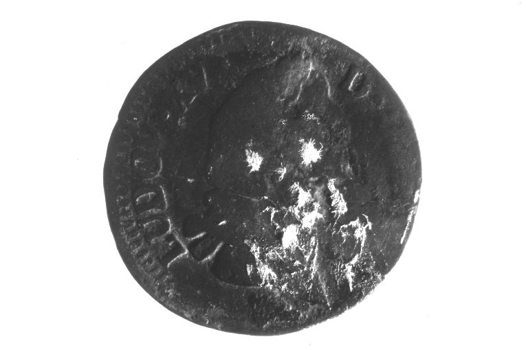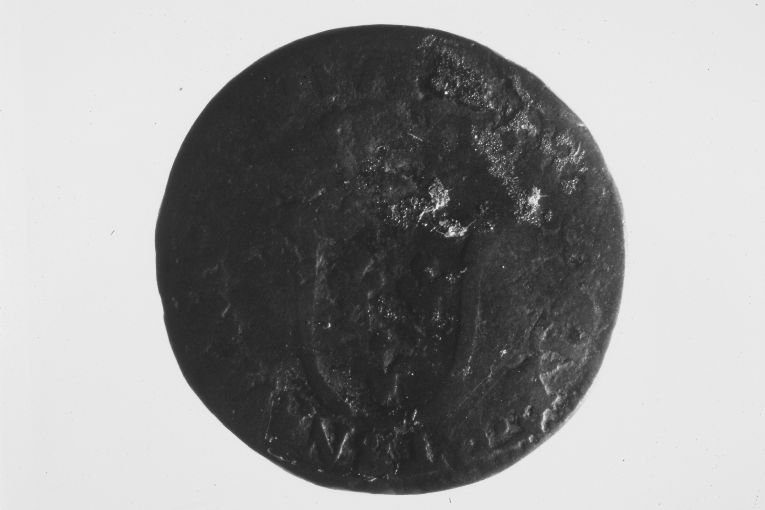 Dritto: arme regale verso scudo sannitico coronato: ha i tre gigli di Francia ordinati 2 e 1. Rovescio: