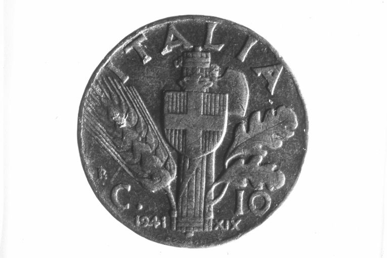 Ritratto di Vittorio Emanuele III re d'Italia, fascio littorio, ramoscello di quercia, spiga di grano, arme regale Savoia