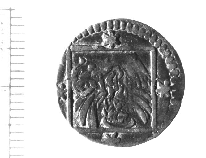 La Beata Vergine tiene il Bambino seduto sul braccio entrambi nimbati; le one in soldo, in un quadro sopra ogni lato: *,