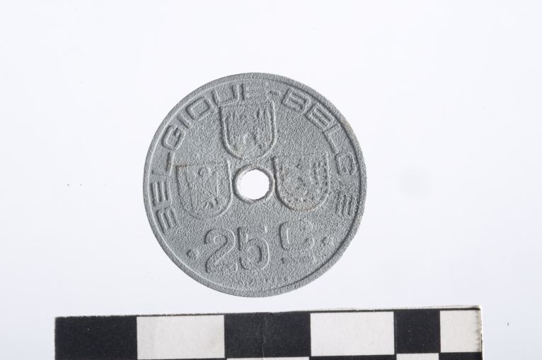 Dritto: Foro circolare, al centro; corona in alto; elementi geometrici, ai lati del foro. Rovescio: Foro circolare, al centro; tre stemmi intorno