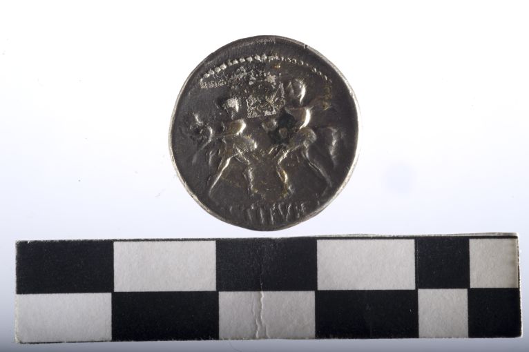 Dritto: Testa nuda e barbata di Tazio, a d.; davanti palma. Rovescio: Due guerrieri romani che sollevano due sabine
