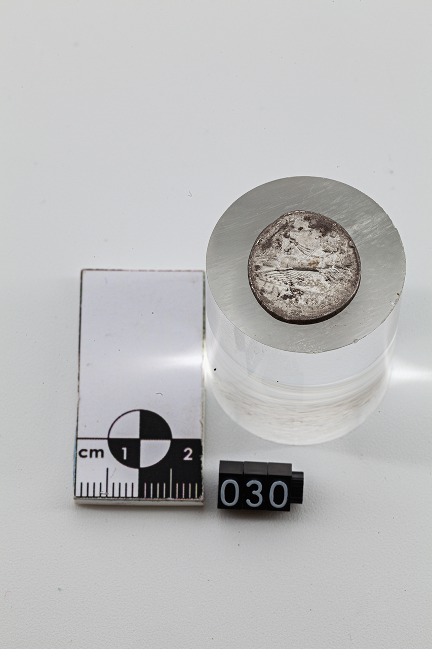 Dritto: Busto maschile, a d.; con gli attributi di Apollo, Mercurio e Nettuno; dietro, lepre (?). Rovescio: L.IVLI.BVRSIO Vittoria con cor. in quadr. al gal, a d
