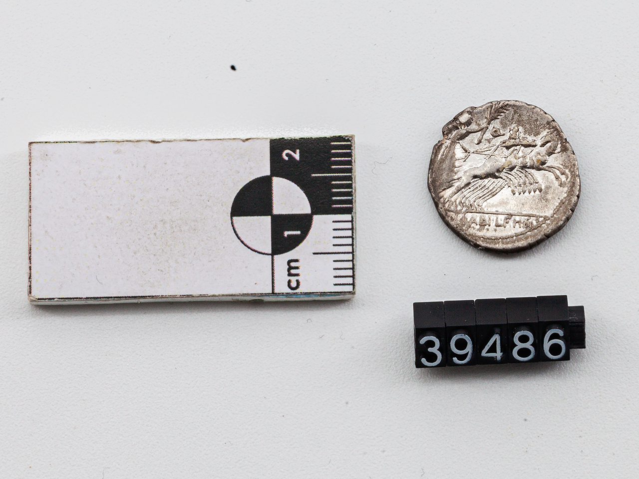 Dritto: Busto femminile a destra, drappeggiato e diademato; dietro, caduceo alato; davanti, bilancia; sotto, simbolo incerto. Rovescio: Vittoria con palma in quadriga alata al galoppo, a destra