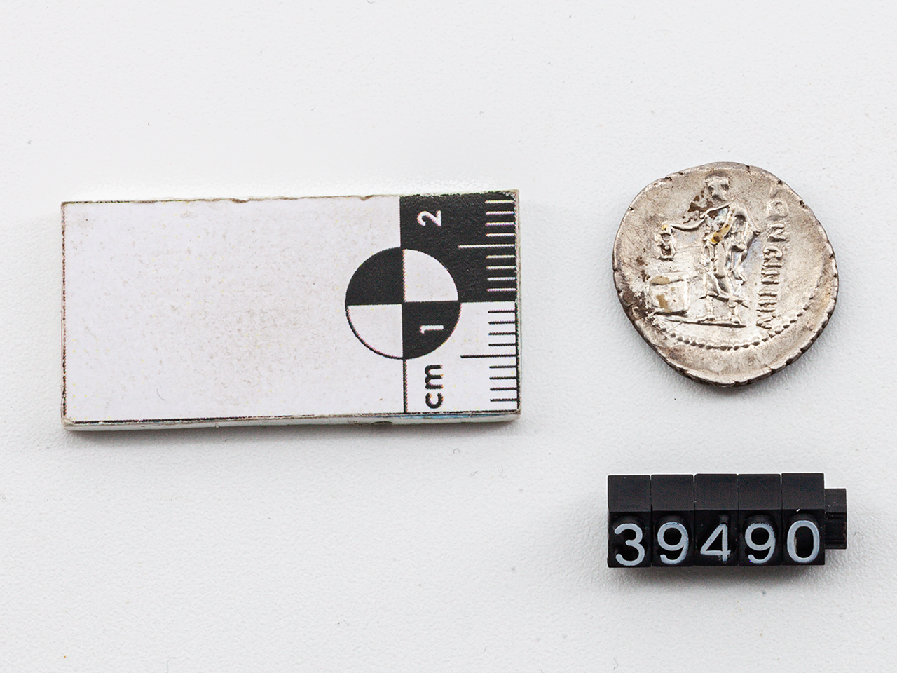 Dritto: Testa velata di Vesta, a sinistra; dietro, kylix. Rovescio: Togato stante a sinistra che depone tabella di voto in una cista