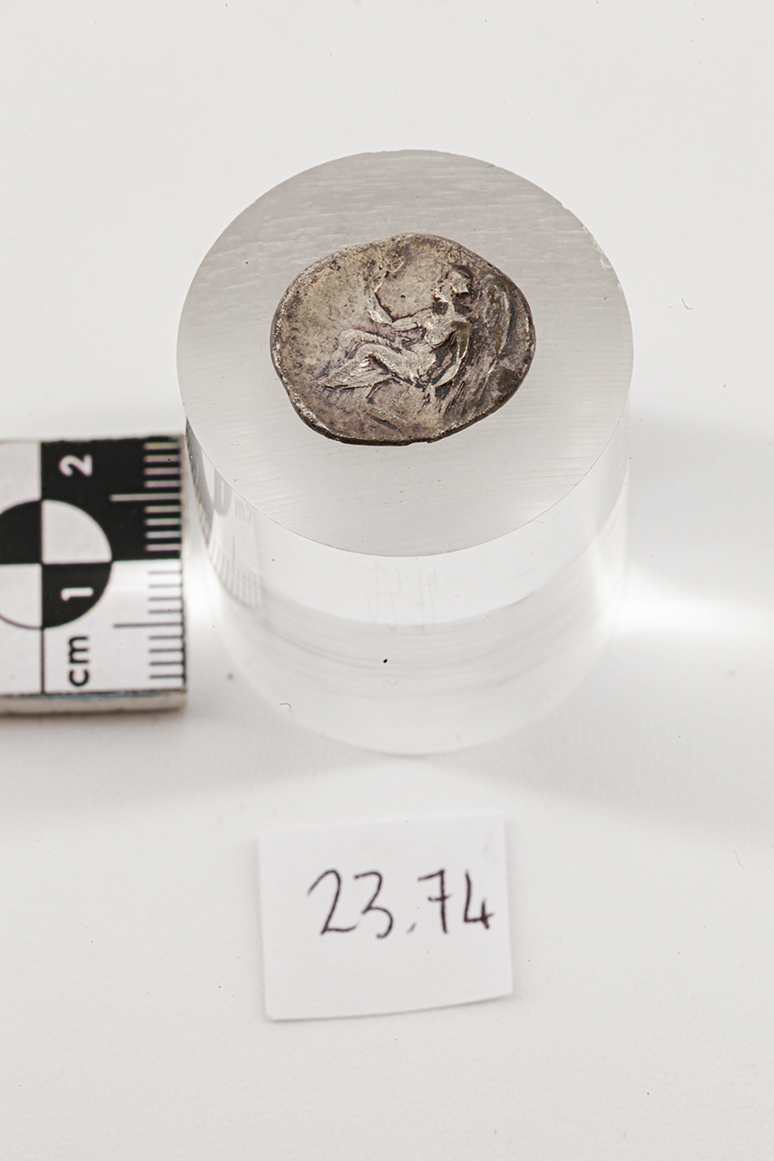 Dritto: testa della ninfa Terina, a sinistra. Rovescio: Nike seduta, a sinistra